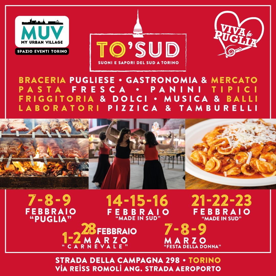 "To Sud" vi aspetta al MUV - My Urban Village (Strada della Campagna, 298 - Via Reiss Romoli) ogni weekend dal venerdì alla domenica, dalle 11.00 alle 24.00. L’ingresso è gratuito. Per maggiori informazioni: 345 0072656- info@muvtorino.it. Non lasciatevi sfuggire l’occasione di vivere il Sud a Torino!