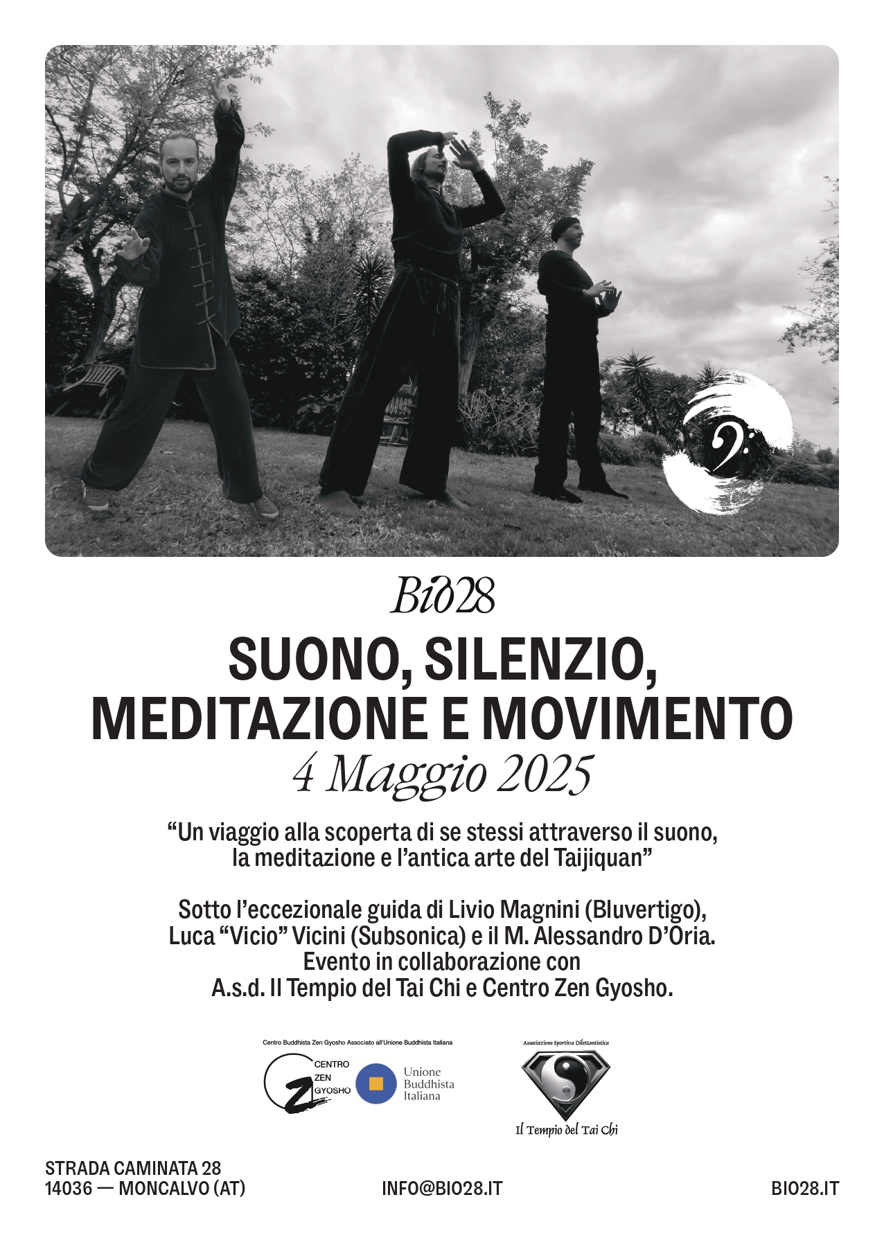 "Suono, Silenzio, Meditazione e Movimento" è organizzato da Bio28 in collaborazione con A.S.D. Il Tempio del Tai Chi e Centro Zen Gyosho. Per informazioni e prenotazioni: info@bio28.it | +39 328 3581023