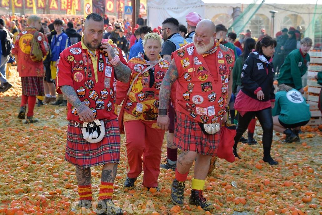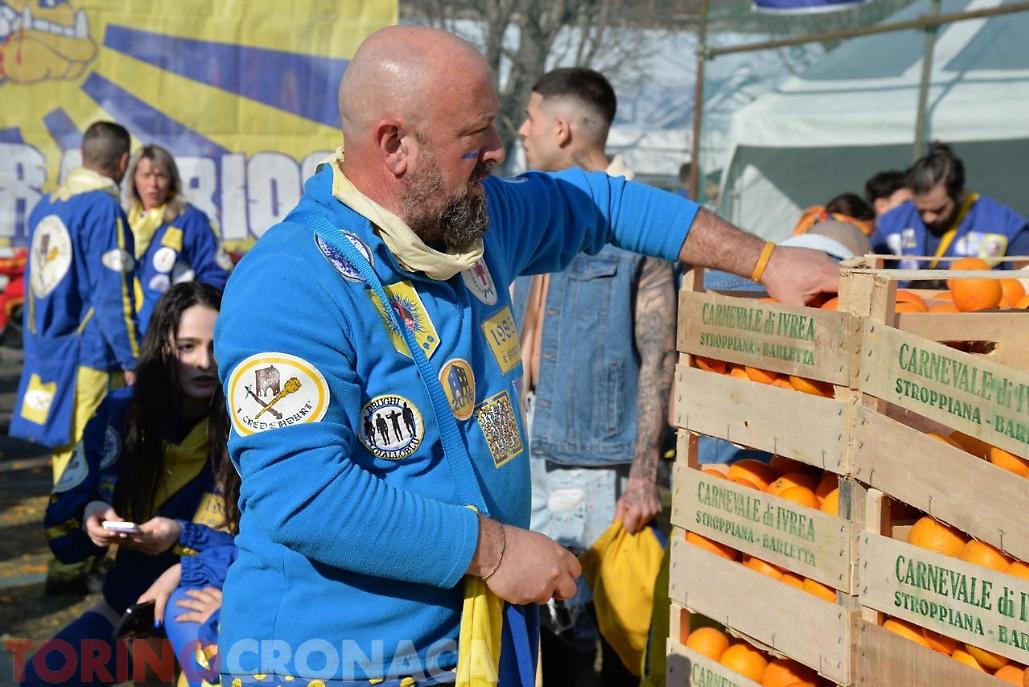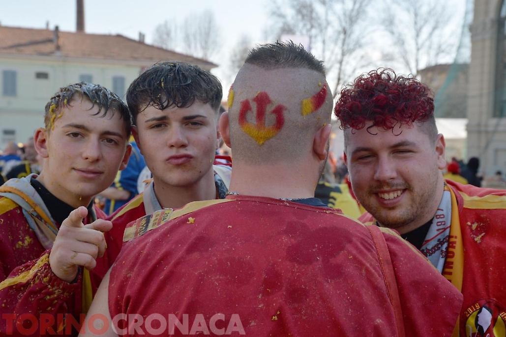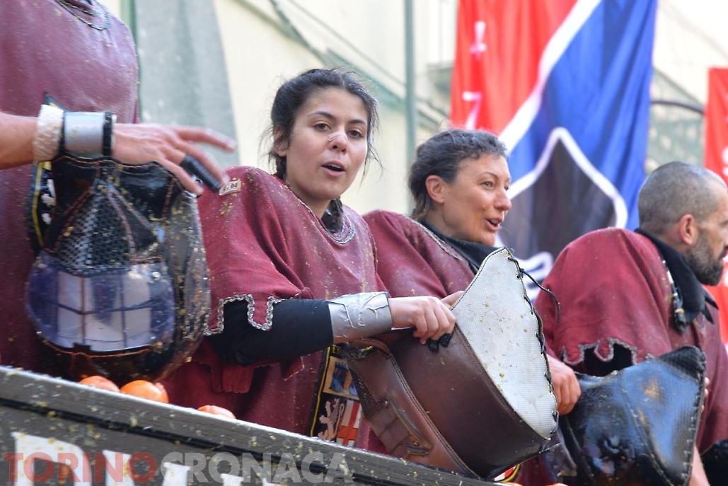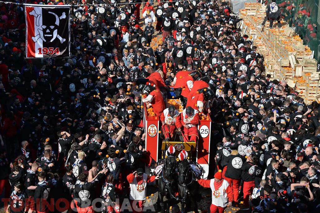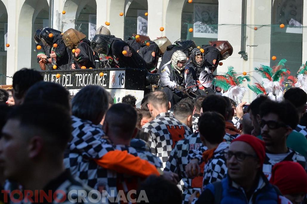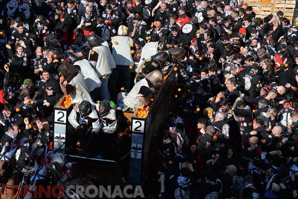 Allegria, sorrisi, colori. E, ovviamente, arance, tante arance. Arance ovunque: in aria, mentre volano da e verso i Carri; a terra, rimasuglio (scivoloso) della Battaglia; e anche su vesti e volti di chi sta battagliando per la propria squadra. Tutto sotto un sole che sta accompagnando al meglio la grande festa di Ivrea, dove oggi si sta vivendo l'evento clou dello Storico Carnevale.