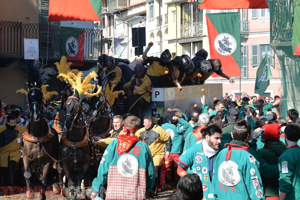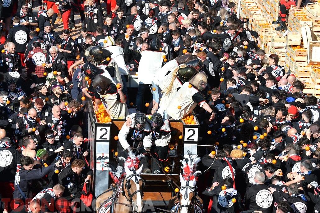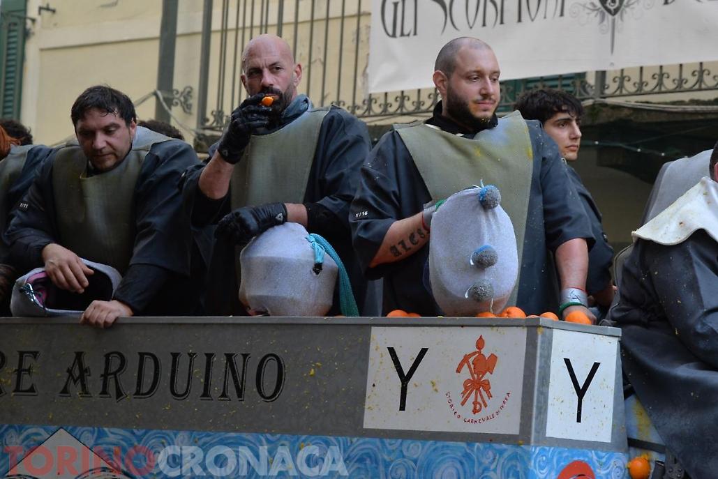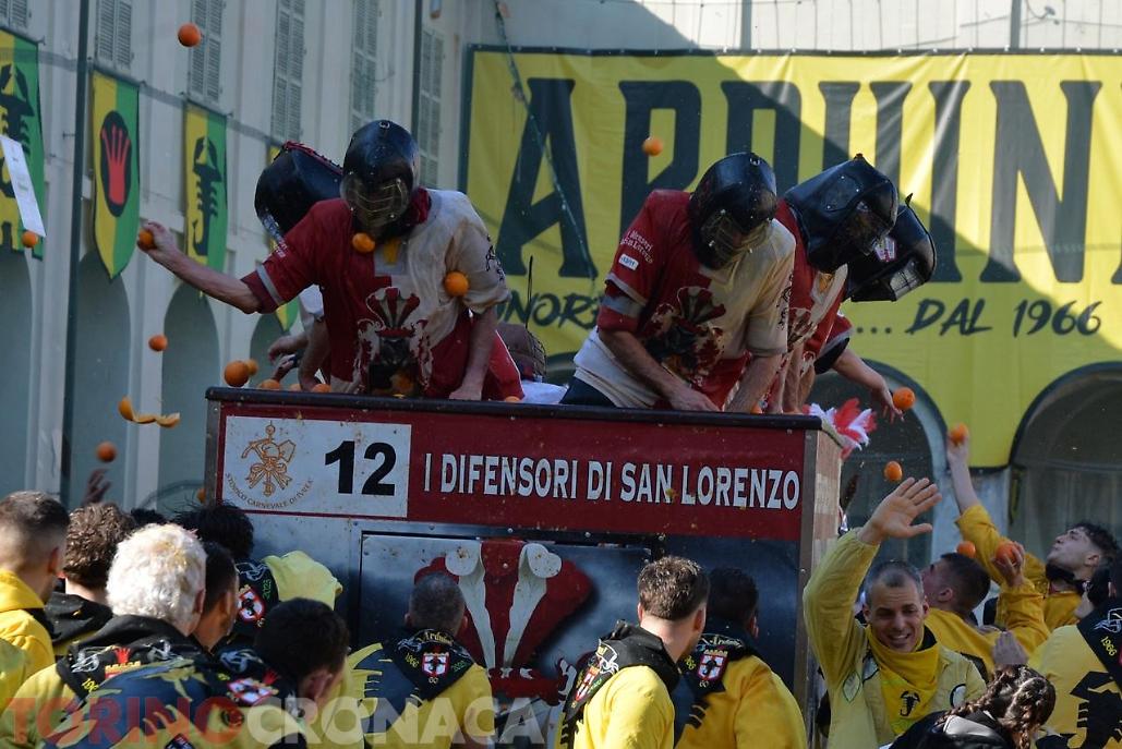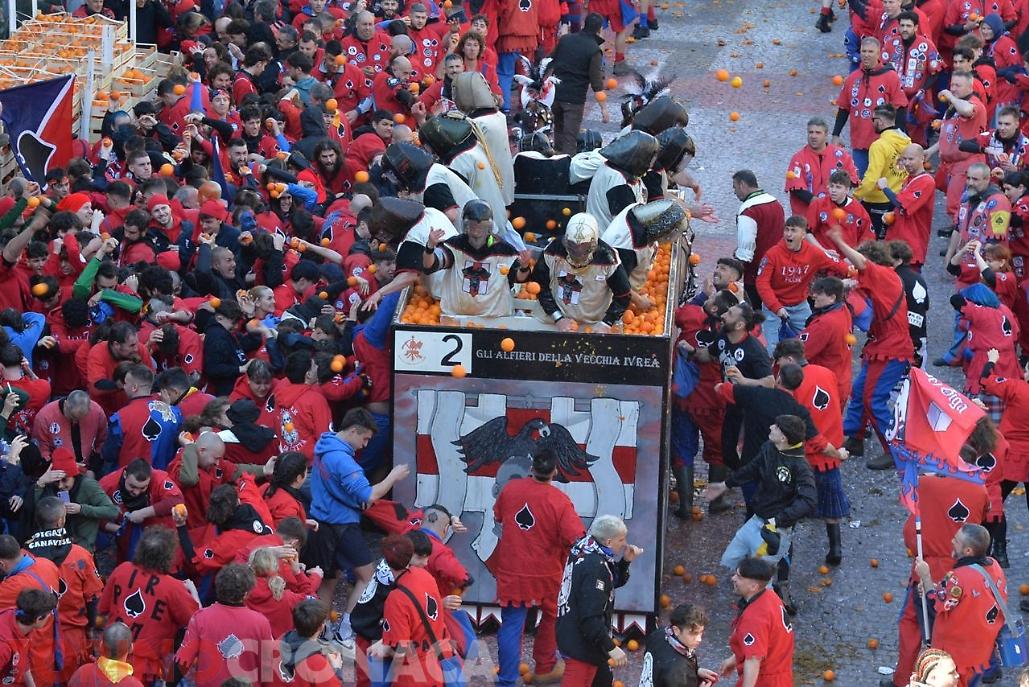 Battaglia che sarà replicata due volte. Domani, lunedì 3 marzo la seconda giornata di battaglia avrà inizio sempre ore 14 e fine alle 17. L’evento si concluderà martedì 4 marzo con l’ultima giornata, al termine della battaglia alle ore 18 premiazione delle squadre degli aranceri a piedi e dei carri da getto in Piazza di Città. Alle 20.15 partenza del corteo storico ed abbruciamento degli Scarli nelle Parrocchie di San Maurizio, Sant'Ulderico e San Lorenzo, San Salvatore e San Grato. Alle 22.45 da Piazza Lamarmora si intona la “funerala” il canto funebre conclusivo e il tradizionale saluto "Arvedze a Giobia 'n bot" in Piazza Ottinetti che segna la fine ufficiale della manifestazione.