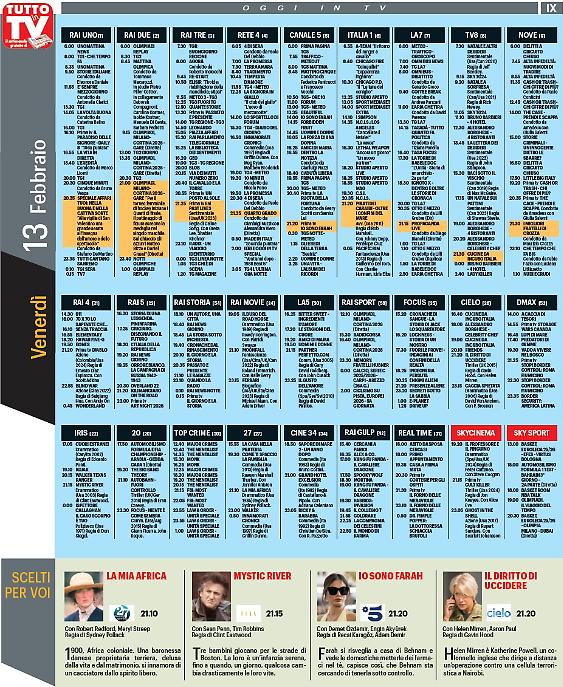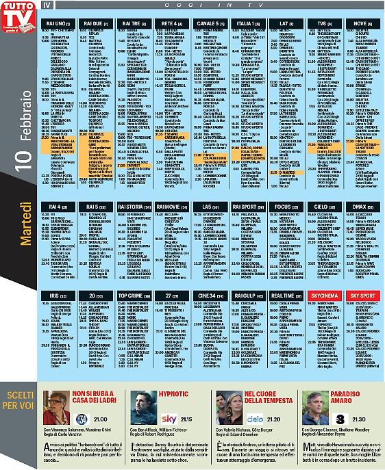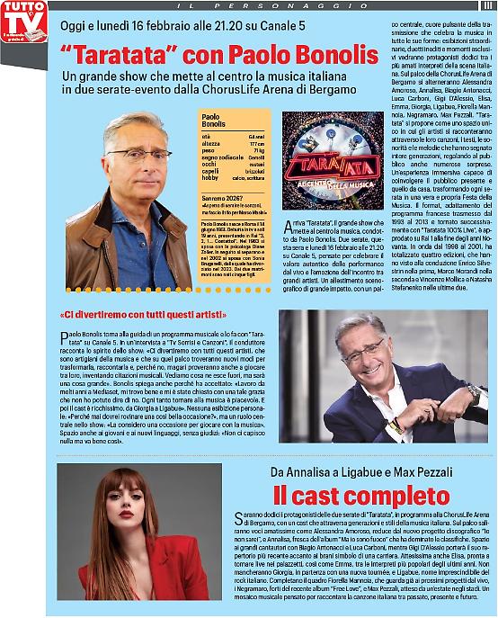 Settimana ricca di appuntamenti in televisione. Si parte questa sera con la grande musica in tv (Canale 5), con " Taratata ", trasmissione condotta da Paolo Bonolis con grandi ospiti protagonisti: da Elisa ad Annalisa, da Giorgia a Ligabue. Una line up di successo. Non solo musica, la settimana che va dal 9 al 15 febbraio sarà riservata anche alla messa in onda nel segno dei grandi amori, per festeggiare nel migliore dei modi la festa degli innamorati, il prossimo 14 febbraio, San Valentino. Infine, da segnalare, su Rai1 uno "Speciale Affari tuoi, nella buona e nella cattiva sorte".
