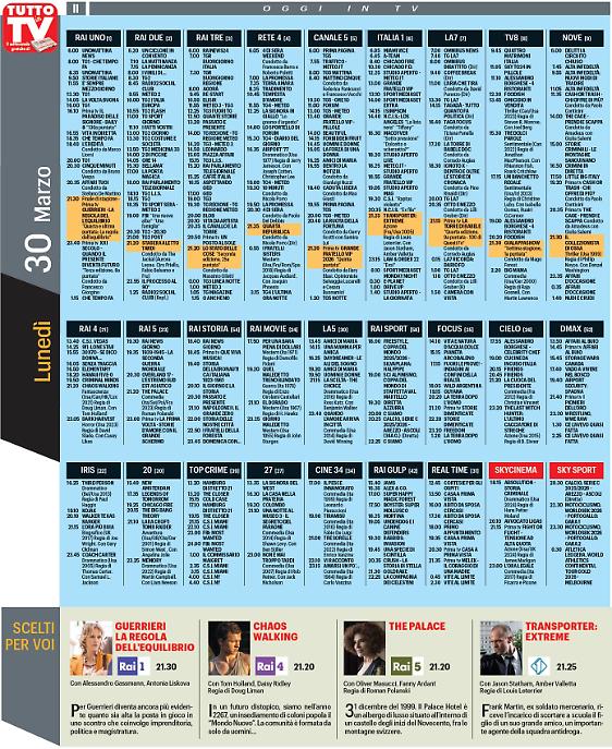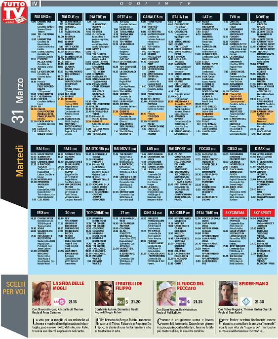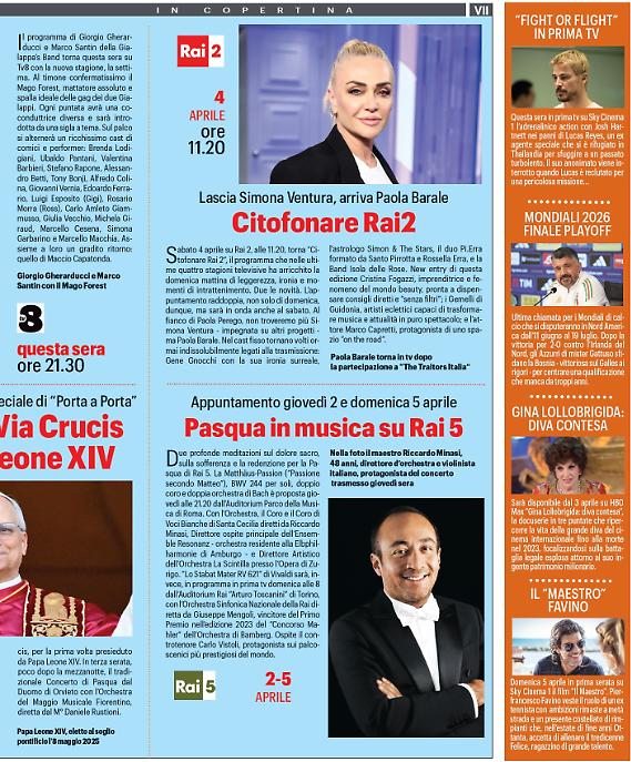 Ma questa che arriva sarà anche la settimana di Pasqua che in tv culminerà con il venerdì santo di Raiuno il 3 aprile. la serata si aprirà alle 20,30 con uno speciale "Porta a porta" di Bruno Vespa dedicato alla tragedia di Crans Montana. A seguire, dalle 21, le telecamere di Raiuno si sposteranno a Roma per seguire la Via Crucis di Papa Leone XIV.