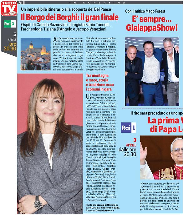 E, infine, anche quest’anno, per la serata di Pasqua, Raitre dalle 20,30 diventa il palcoscenico del “Borgo dei Borghi”. In onda la serata finale della tredicesima edizione del grande concorso di bellezza che vede protagonisti, ogni anno, 20 tra i più bei borghi d’Italia, uno per regione. Come da tradizione, sarà Camila Raznovich a portarci tra luoghi affascinanti, sorprendenti e carichi di fascino. Tra gli ospiti: il regista Fabio Toncelli, l’archeologa Tiziana D’Angelo e Jacopo Veneziani.