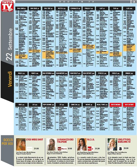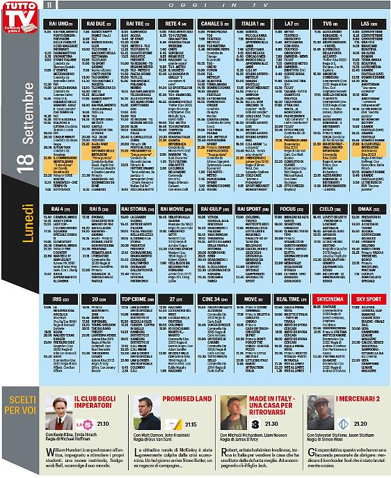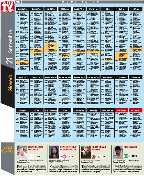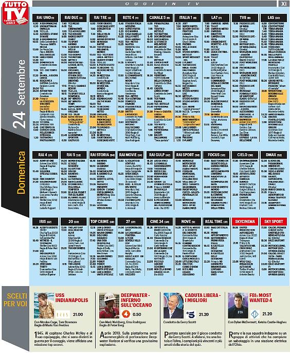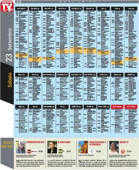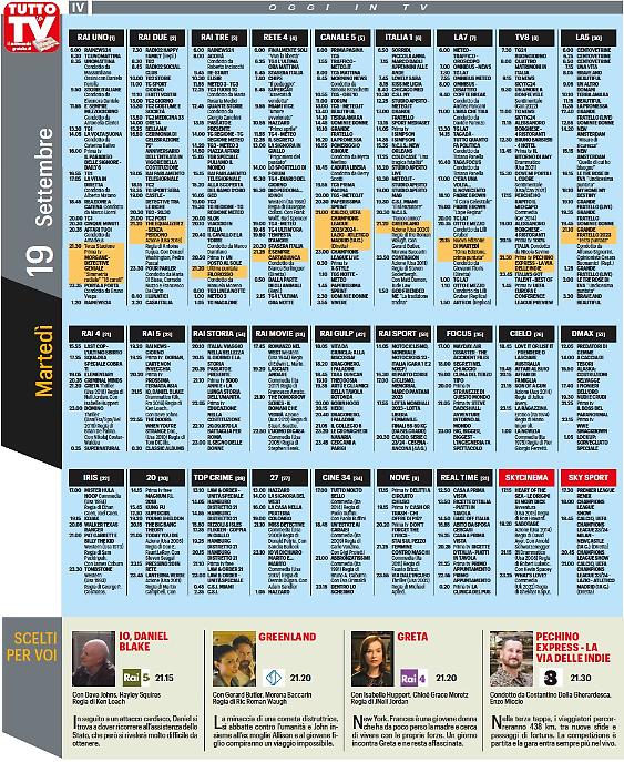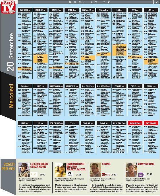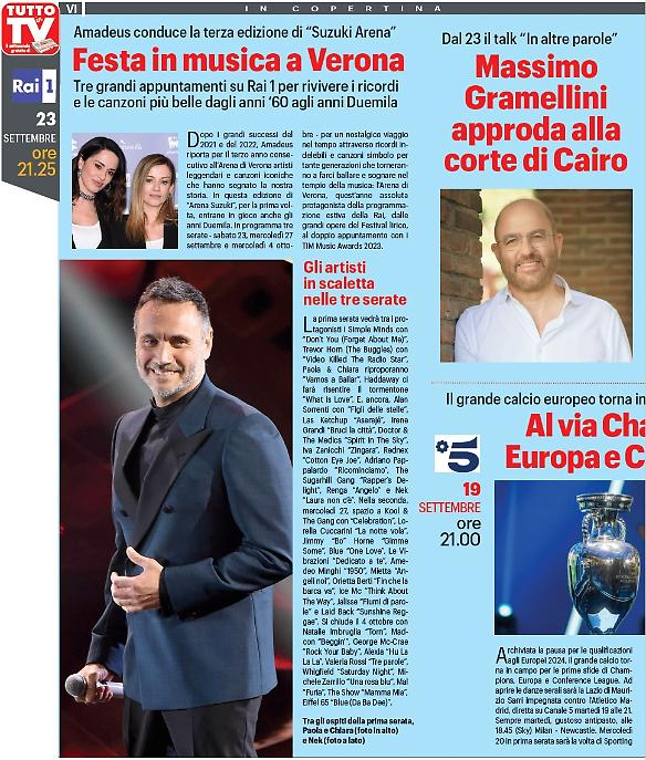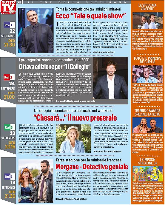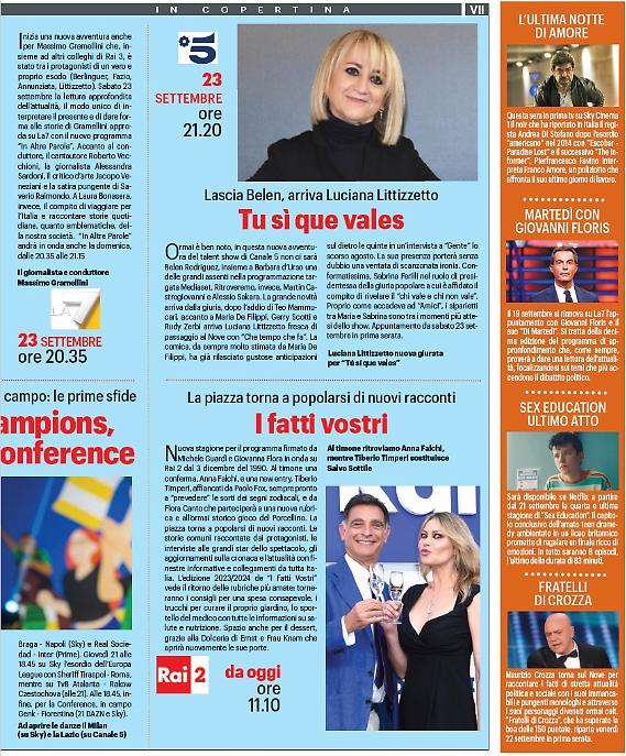 Da non perdere in settimana anche il ritorno delle coppe europee di calcio e la prima puntata del programma Mediaset "Tù Sì Que vales". Il talent show di Canale 5 si prepara per una nuova edizione, e una delle grandi assenti sarà Belen Rodriguez. Tuttavia, ci saranno Martin Castrogiovanni e Alessio Sakara nel cast. La principale novità riguarda la giuria, con l'uscita di Teo Mammucari e l'ingresso di Luciana Littizzetto, fresca di esperienza al Nove con "Che tempo che fa". Maria De Filippi, Gerry Scotti e Rudy Zerbi rimangono nella giuria, e la presenza di Littizzetto promette di portare un tocco di scanzonata ironia al programma. Sabrina Ferilli è stata confermata nel ruolo di presidentessa della giuria popolare, incaricata di svelare chi ha talento e chi no, proprio come faceva in "Amici". Gli scambi divertenti tra Maria e Sabrina sono tra i momenti più attesi dello show. L'appuntamento è fissato per sabato 23 settembre in prima serata.