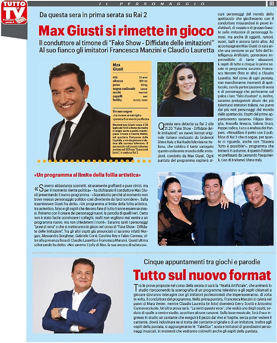 Questa sera, Rai 2 presenterà il debutto di "Fake Show - Diffidate delle imitazioni" alle 21.20, un nuovo programma originale italiano realizzato da Endemol Shine Italy e Rai RadioTelevisione Italiana. Il conduttore, Max Giusti, guiderà il pubblico attraverso il divertente mondo delle imitazioni, ospitando personaggi dello spettacolo che si sfideranno in prove individuali, di coppia o di gruppo, basate su imitazioni di celebrità, oggetti, rumori, suoni, balli e altro. Inoltre, l'Intelligenza Artificiale farà parte dello spettacolo, creando situazioni imprevedibili. Le prime cinque serate vedranno Francesca Manzini e Claudio Lauretta come ospiti fissi.
