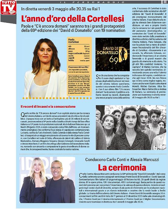 Centosettantuno film italiani, 61 opere prime 138 documentari, 495 cortometraggi. Sono i numeri che raccontano l'importanza del concorso dei Premi David di Donatello assegnati ai film usciti nelle sale cinematografiche italiane nel corso del 2023. A raccontare la 69a edizione della cerimonia dagli studi di Cinecittà sono Carlo Conti e Alessia Marcuzzi, in diretta il 3 maggio alle 20.40 su Rai1 e in esclusiva in 4K al canale 210 della piattaforma gratuita satellitare tivùsat. Occhi puntati, in particolar modo, su "C'è ancora domani", film di Paola Cortellesi che ha raccolto 19 candidature ai David di Donatello 2024, un vero record, ancora di più se consideriamo che questo è il suo esordio come regista.
