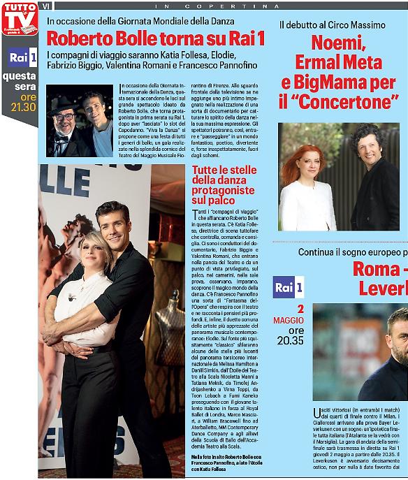 Tra gli ospiti, oltre ad alcune delle stelle più brillanti della danza provenienti da tutto il mondo, Elodie, Katia Follesa, Francesco Pannofino, Fabrizio Biggio, Valentina RomaniIn occasione della Giornata Internazionale della Danza, il 29 aprile, in prima serata su Rai 1 un grande spettacolo evento voluto da RAI e dal Ministero della Cultura e ideato da Roberto Bolle per celebrare l’arte della danza in Italia. "Viva la Danza" – prodotto da Rai Direzione Intrattenimento in collaborazione con Ballandi e Artedanza srl – sarà innanzitutto una grande festa di tutti i generi di ballo, un grande gala realizzato al Teatro del Maggio Musicale Fiorentino di Firenze, uno dei teatri più grandi del mondo, gioiello di innovazione.