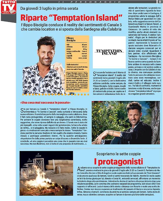 Il mese di luglio comincia con il botto in televisione. L'attesa è finita, "Temptation Island", uno dei programmi più attesi della bella stagione, è pronto a ripartire. Filippo Bisciglia, confermatissimo alla guida del programma, presenterà la storia di sette nuove coppie pronte a rimettersi in gioco davanti alle telecamere, alle prese con tentatrici e tentatori. Come andrà a finire? Appuntamento il prossimo 3 luglio su Canale 5 per la prima puntata.
