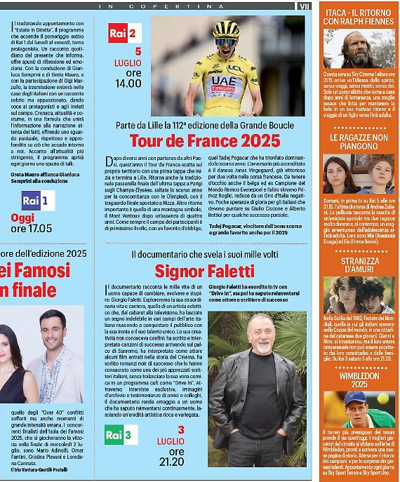 Dal reality più caldo dell'estate, alla corsa ciclistica più importante al mondo, ovvero il Tour de France. Appuntamento per la partenza della 112esima Grande Boucle è per sabato 5 luglio con diretta televisiva su Rai 2.