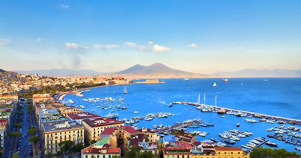 Panorama of Naples, view of the port in the Gulf of Naples, the Egg Castle, and Mount Vesuvius
