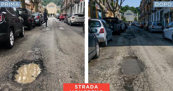 Un rattoppo su cui si vedono anche i segni delle gomme del mezzo che è passato subito dopo la colata di asfalto. Un grossolano intervento di manutenzione per mettere una pezza su una pavimentazione che sembra davvero un percorso a ostacoli. «Però non è tutto da buttare» commenta Marco. In città, comunque, ci sono ancora tante strade che attendono un’aggiustata.