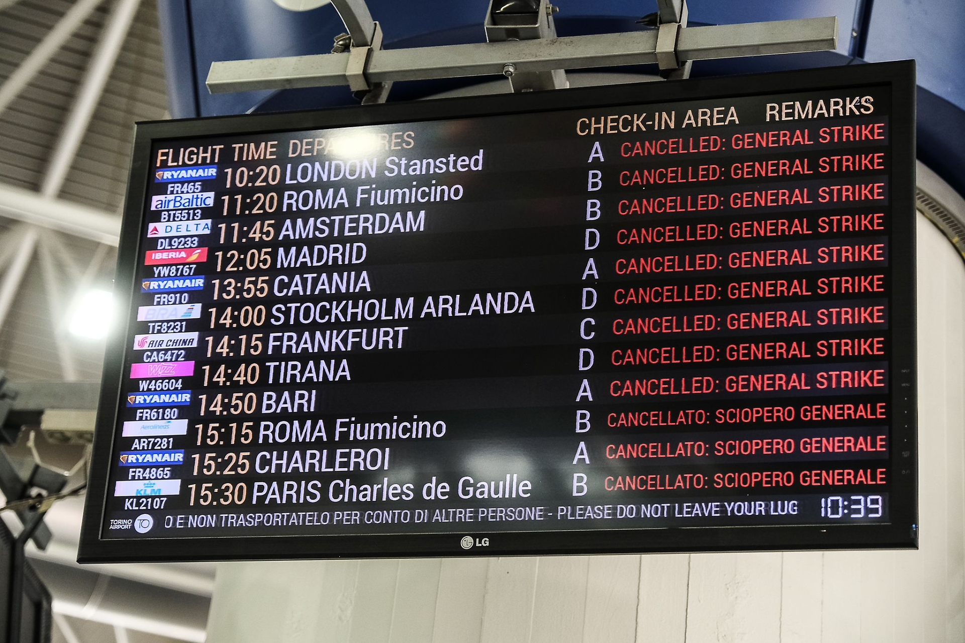 Deserto a Caselle, caos a Malpensa. Si può riassumere così il sabato nero del trasporto aereo, a causa dello sciopero andato in scena - per otto ore in tutta Italia - del personale dell’handling, carico e scarico dei bagagli, addetti al check-in, piloti e cabin crew. Allo scalo torinese, il deserto più assoluto. Del resto, erano trenta i voli cancellati, in arrivo o in partenza all'aeroporto internazionale “Sandro Pertini”. Il primo volo a non partire è stato quello per Dublino di Ryanair. Le cancellazioni hanno riguardato anche voli di Ita Airways, Air France, Air Dolomiti, Klm, Iberia e Wizz air, con destinazioni in Italia e in altri paesi europei. Solo per ricordare alcune mete, non partivano gli aerei diretti a Londra, Roma, Amsterdam, Madrid, Catania, Stoccolma, Francoforte, Tirana, Bari, Parigi e Charleroi. «Il nostro volo per Tirana doveva partire alle 14.40 - spiega un papà con la figlia, albanesi - ma è stato cancellato. In Albania abbiamo la famiglia, il prossimo volo non so quando riusciamo a prenderlo».