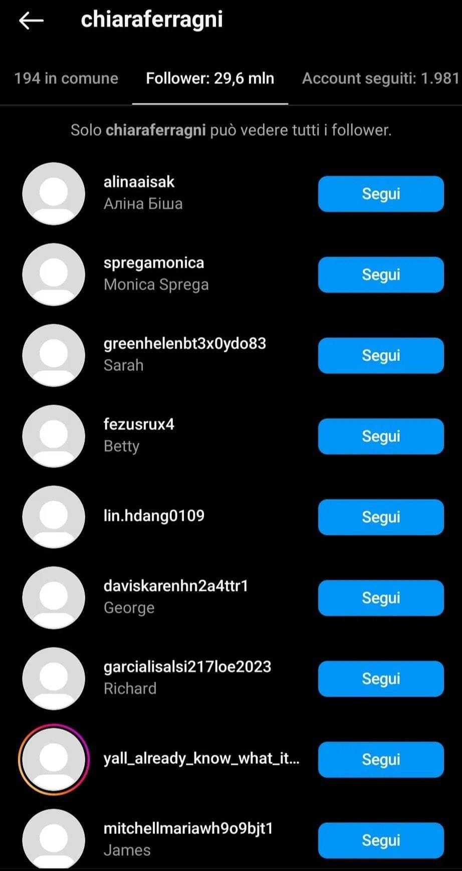 "Sarà un caso, ma nonostante i follower persi sembra che Chiara Ferragni abbia sempre nuovo seguito. Guardando la lista dei suoi follower, che Instagram fornisce in versione limitata (solo lei puoi vederli tutti) si nota che molti hanno aperto il profilo da pochissimo", commenta il giornalista Daniele Polidoro, fornendo una panoramica degli ultimi utenti, che hanno iniziato a seguire la Ferragni.