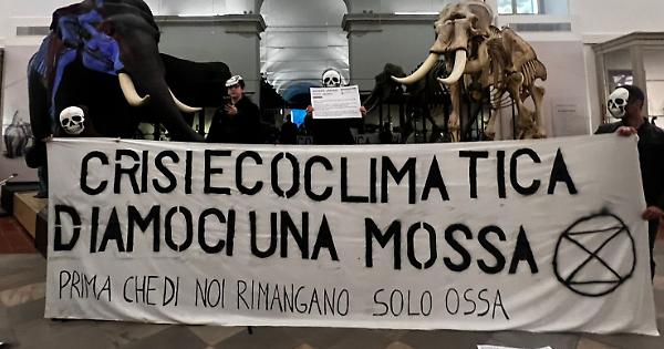 La motivazione della protesta, scenografica come sempre sono le loro, è la totale assenza di uno spazio all’interno del Museo delle Scienze Naturali che tratti la questione del cambiamento climatico. “Pare che i lavori all’interno del museo, che consentiranno una totale apertura al pubblico con tutti gli spazi realizzati, termineranno entro il 2030. Ci chiediamo se dobbiamo attendere ancora sei anni. È irreale che una tematica così attuale ed importante non sia trattata da luoghi come questo.” E così, 4 persone si sono posizionate al centro del Museo, nel punto dove si trovano i due elefanti. Gli attivisti indossano delle maschere raffigurati dei teschi e tengono in mano uno striscione con scritto “Crisi Ecoclimatica: diamoci una mossa, prima che di noi rimangano solo ossa”.