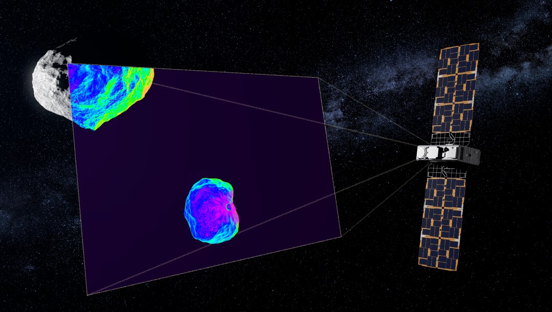 Una simulazione del nanosatellite Milani intento a mappare l'asteroide. Partirà a ottobre e in due anni dovrebbe raggiungere l'asteroide Didymos per effettuare le analisi di materia