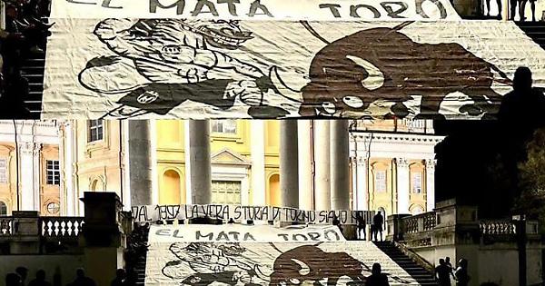 A poche ore dall'attesissimo derby Toro-Juve, ecco la provocazione degli ultras bianconeri a Superga, il luogo simbolo della tifoseria granata. I Drughi, storico gruppo di tifosi ultras della Juventus, hanno appeso tre striscioni sulla scalinata della Basilica, dove 75 anni fa trovò la morte il Grande Torino in un incidente aereo: uno striscione con il loro nome, un altro striscione con la scritta "Dal 1897 la vera storia di Torino siamo noi!!" e un terzo, più grande, conla scritta "El mata Toro" e la raffigurazione di una zebra che sta infilzando un toro nell'arena durante una corrida.