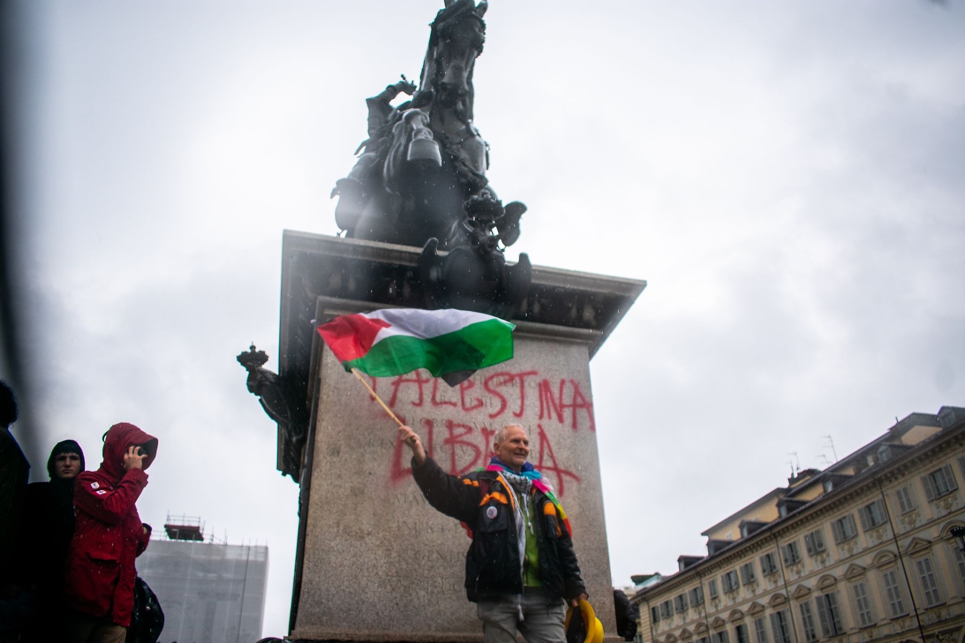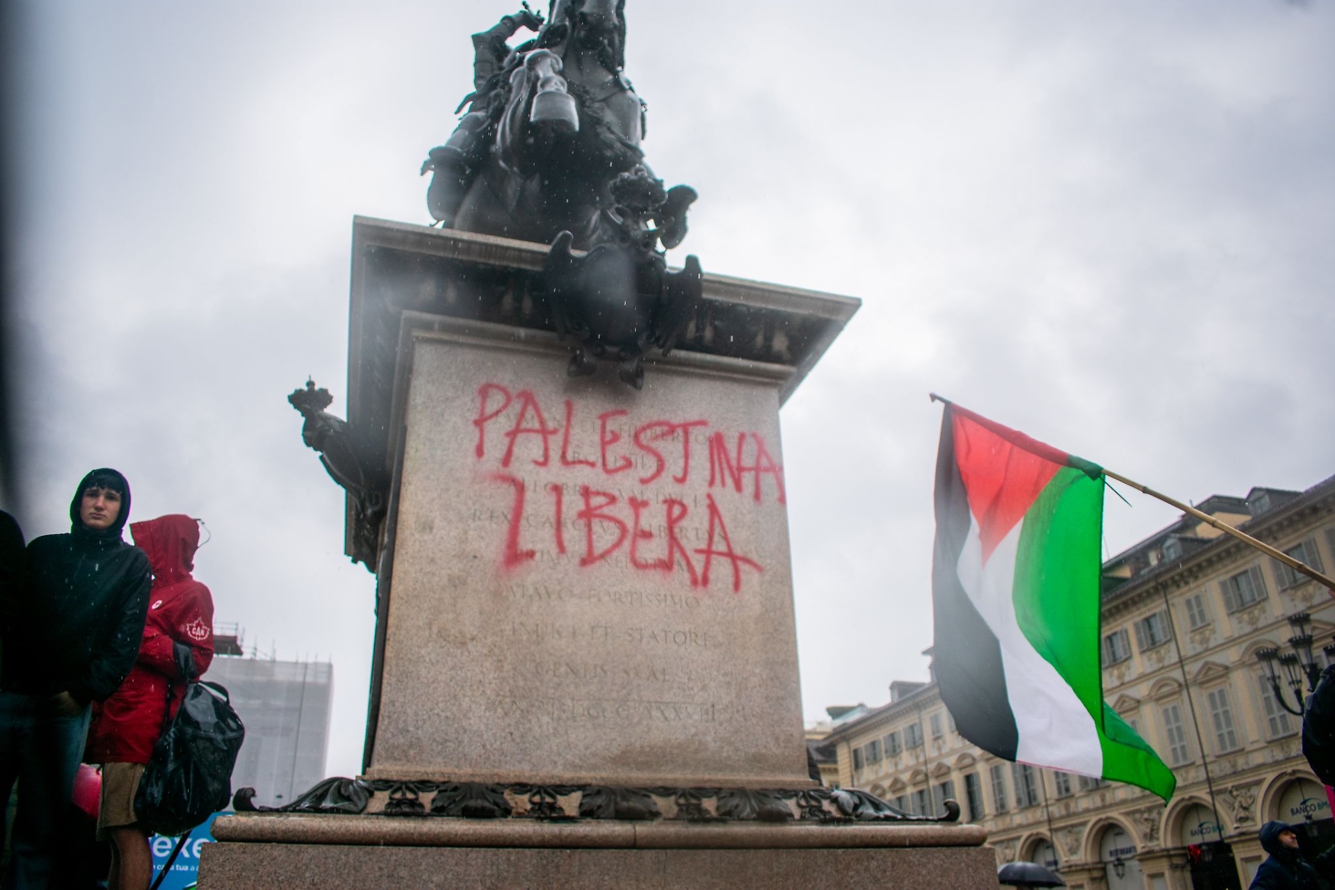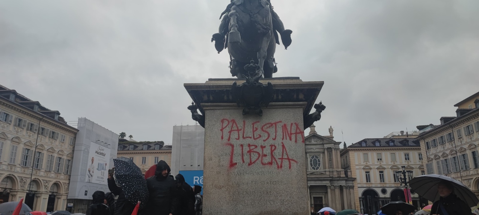 "Palestina libera". Eccolo il "ricordino" che alcuni manifestanti hanno lasciato in piazza San Carlo al termine del corteo per la festa dei lavoratori del 1° maggio. Due parole scritte con la vernice rossa sul basamento del Cavàl 'd Brons, il monumento simbolo del "salotto buono" del centro città. Rivendicazioni? Al momento non ce ne sono, ma il brutto gesto resta, perché in nome del "cessate il fuoco" in Medio Oriente è stato deturpata la statua simbolo della piazza.