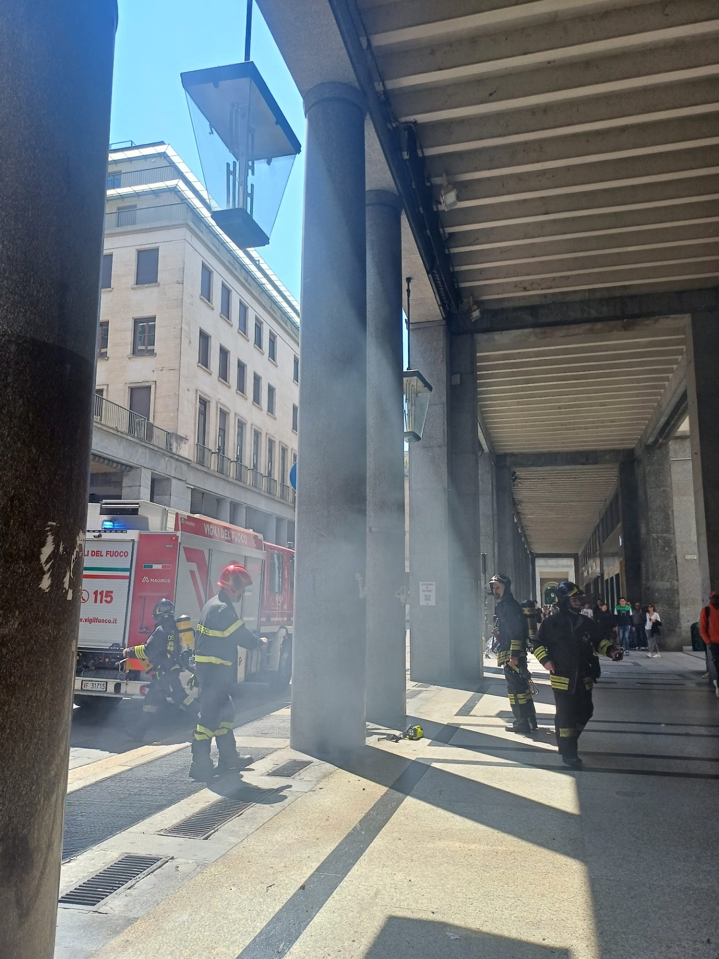 Incendio, ieri mattina (11 maggio), in una cantina in via Roma. Il fatto intorno alla mezza. Il fumo ha completamente invaso il portico, tra i negozi H&M e Falconeri, allarmando i passanti e i commercianti del centro.