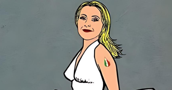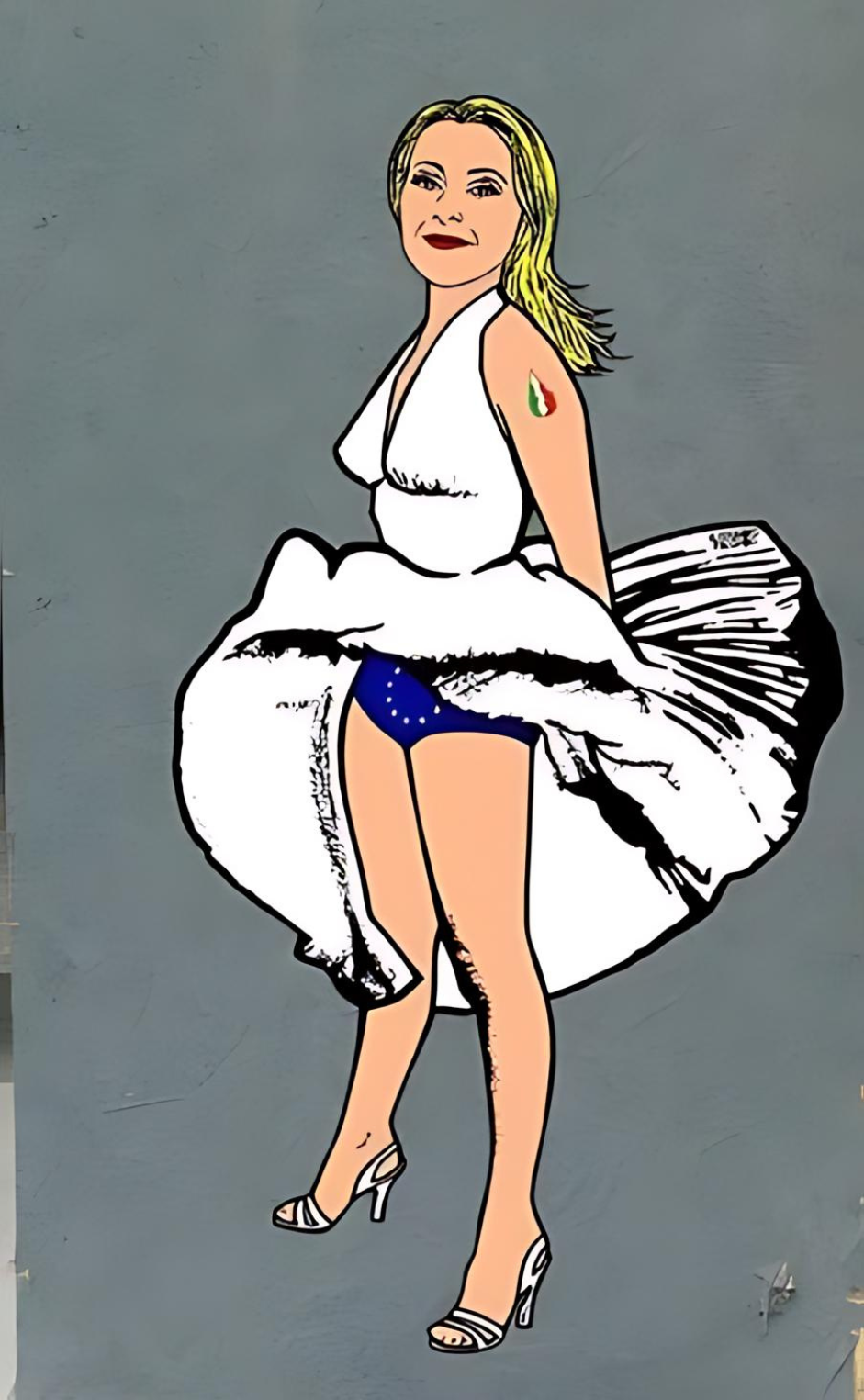 Meloni come Marilyn Monroe nell’opera di AleXsandro Palombo intitolata “Pop Giorgia” e creata a Milano