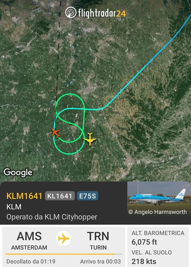 Il "girotondo" cui è stato costretto il volo Amsterdam-Torino in attesa di poter atterrare all'aeroporto di Caselle (fonte Flightradar24)