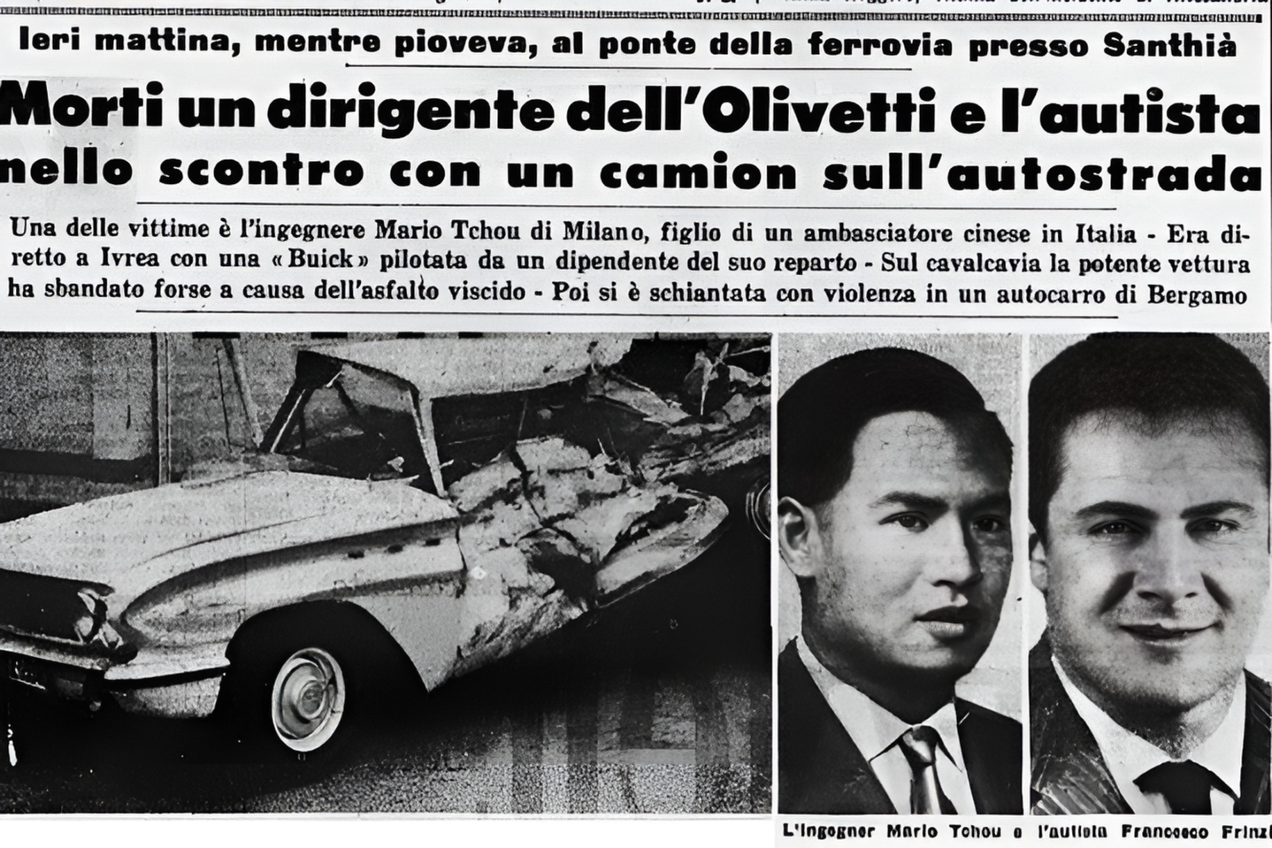 I testimoni sono concordi, «quel giorno pioveva, la strada era sdrucciolevole». Per questo, almeno secondo i carabinieri, la Buick Skylark guidata dall’autista Francesco Finzi, che conduceva Mario Tchou a Ivrea, si schiantò contro un camion nei pressi dello svincolo di Santhià il 9 novembre del 1961. I due uomini morirono sul colpo. Ma dai rapporti dell’epoca emergono anche altri particolari: la velocità dell’auto dello scienziato cinese braccio destro di Andriano Olivetti e inventore del primo computer al mondo, procedeva a velocità moderata, i soccorritori non trovarono alcun segno di frenata e l’ipotesi che la Buick Skylark fosse stata centrata di proposito non è mai stata confutata.