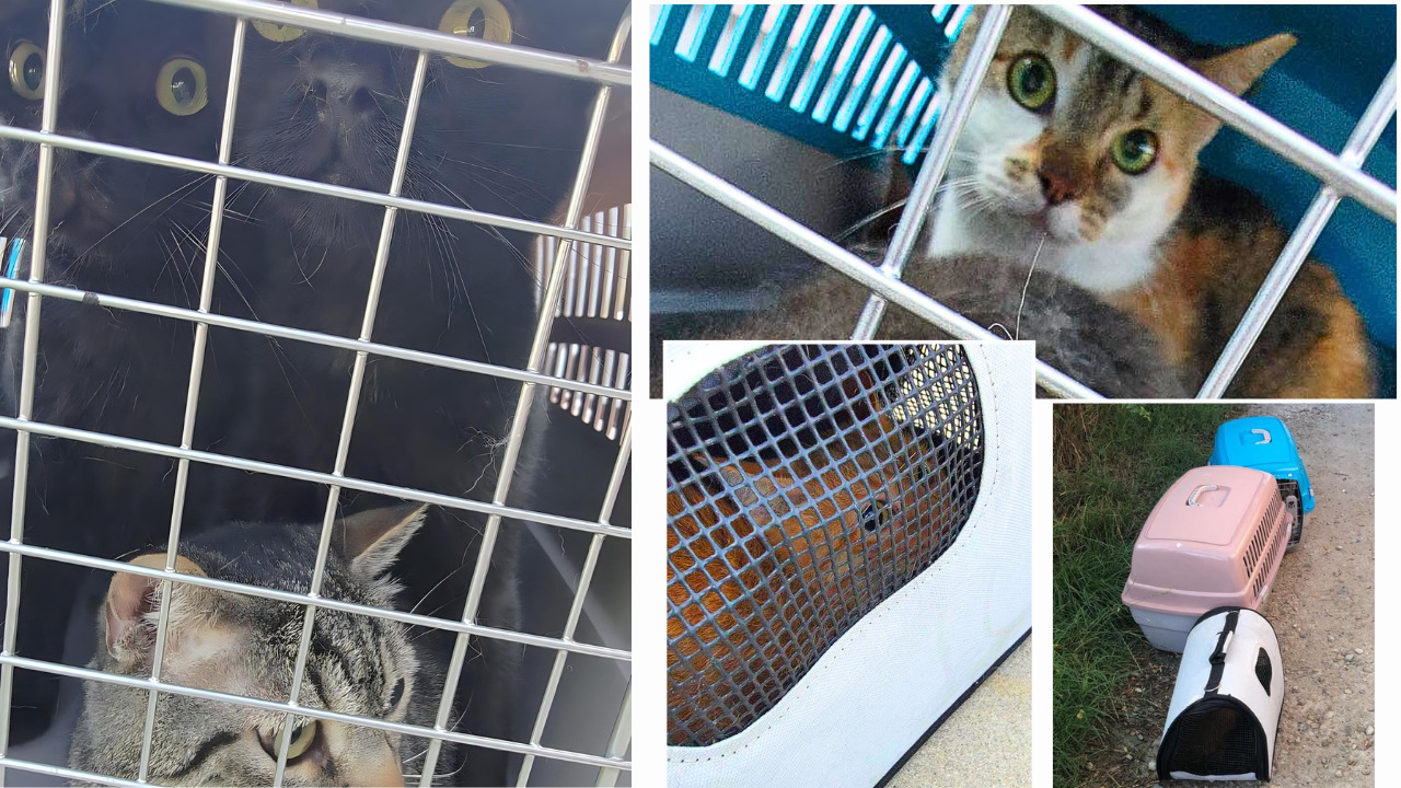 I gatti che sono stati lasciati davanti all’ingresso, rinchiusi nei loro trasportini