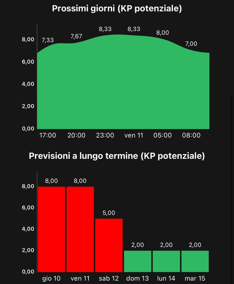 A segnalarlo è Andrea Vuolo, il meteorologo del Tg3 Piemonte, che sottolinea come questa sera occorra «puntare gli occhi verso Nord» per la possibile «osservazione dell’aurora boreale anche dal Nord Italia. Previsione indice aurorale KP 8.33 (su un massimo di 9)». L'indice aurorale è un parametro che misura l'attività magnetica e aurorale e, per capire di cosa stiamo parlando, il 10 maggio era lievemente inferiore a quello di questa notte. Ecco il grafico di previsione, diffuso dallo stesso Andrea Vuolo, dell'indice aurorale KP e della fascia oraria dove quest'ultimo sarà più elevato: