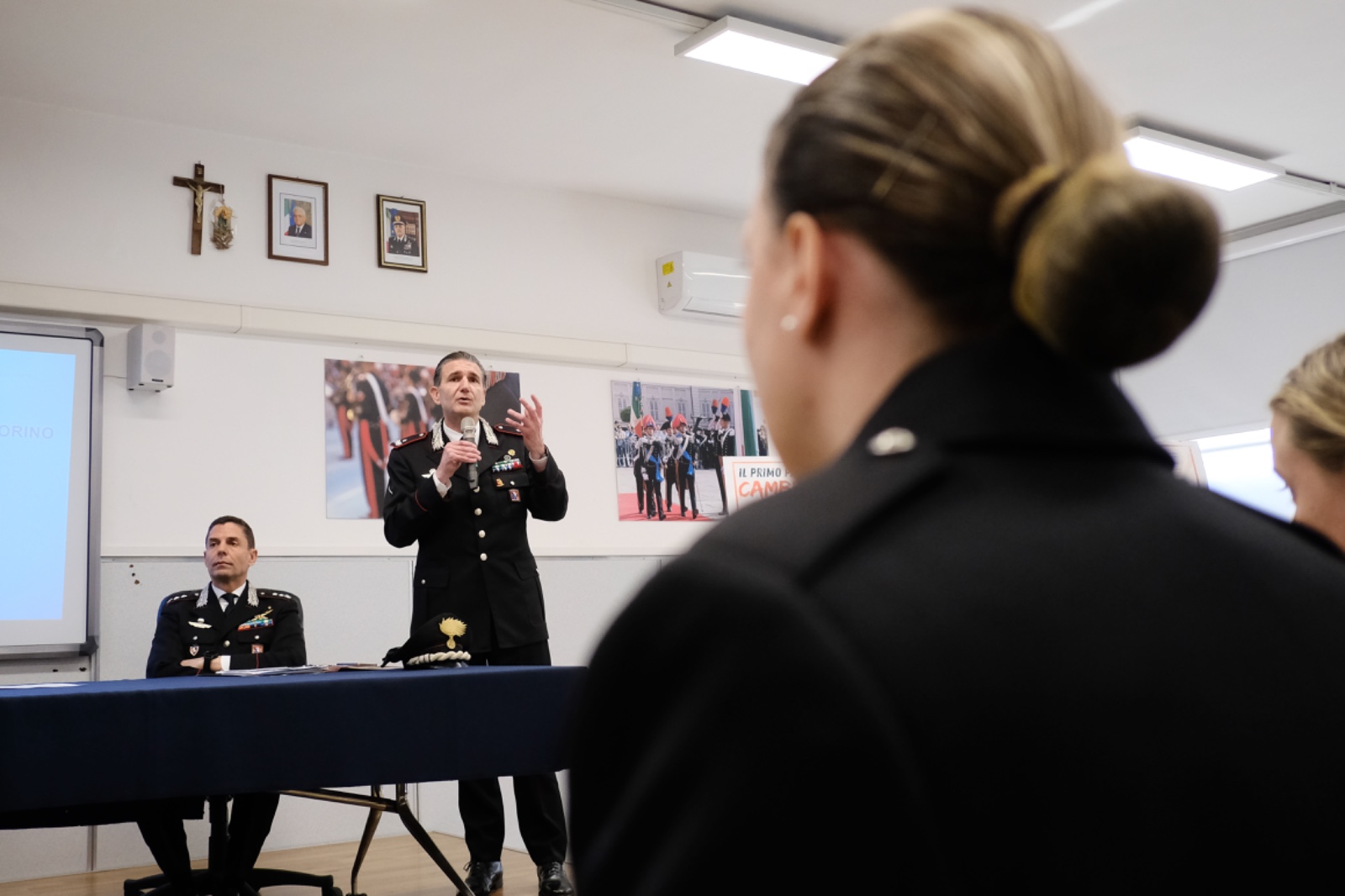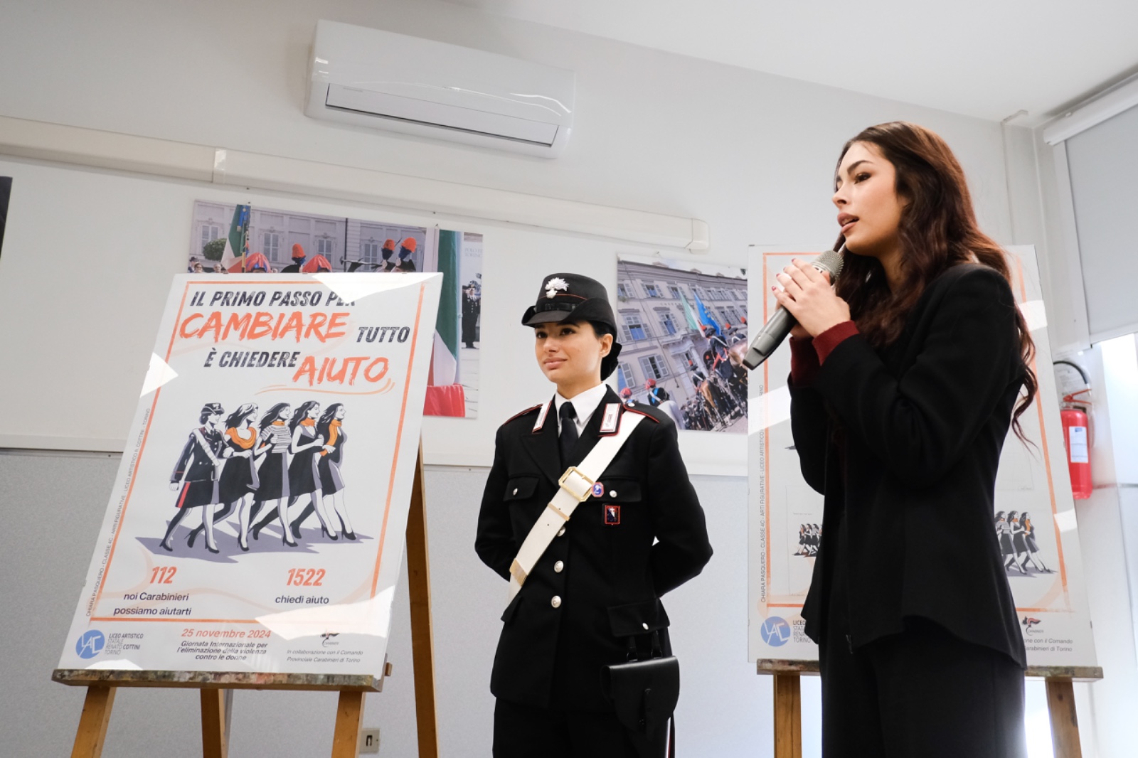 Il progetto vincente è stato quello di Chiara, studentessa al quarto anno del Cottini. “Il primo passo per cambiare tutto è chiedere aiuto”, recita il claim del manifesto, che ritrae cinque donne (tra cui una carabiniera) con sotto i numeri 112 e 1522. «Ho pensato a questo manifesto dopo aver visto i video dei carabinieri contro la violenza di genere. Volevo che fosse un messaggio di speranza», ha raccontato la giovane studentessa, nella giornata di oggi, 25 novembre, che il Comando provinciale ha dedicato, nella sede di via Valfré, alla lotta contro la violenza di genere. Per il terzo anno consecutivo, ospiti dei carabinieri sono stati gli studenti del liceo artistico Cottini, accompagnati dal dirigente Antonio Balestra.