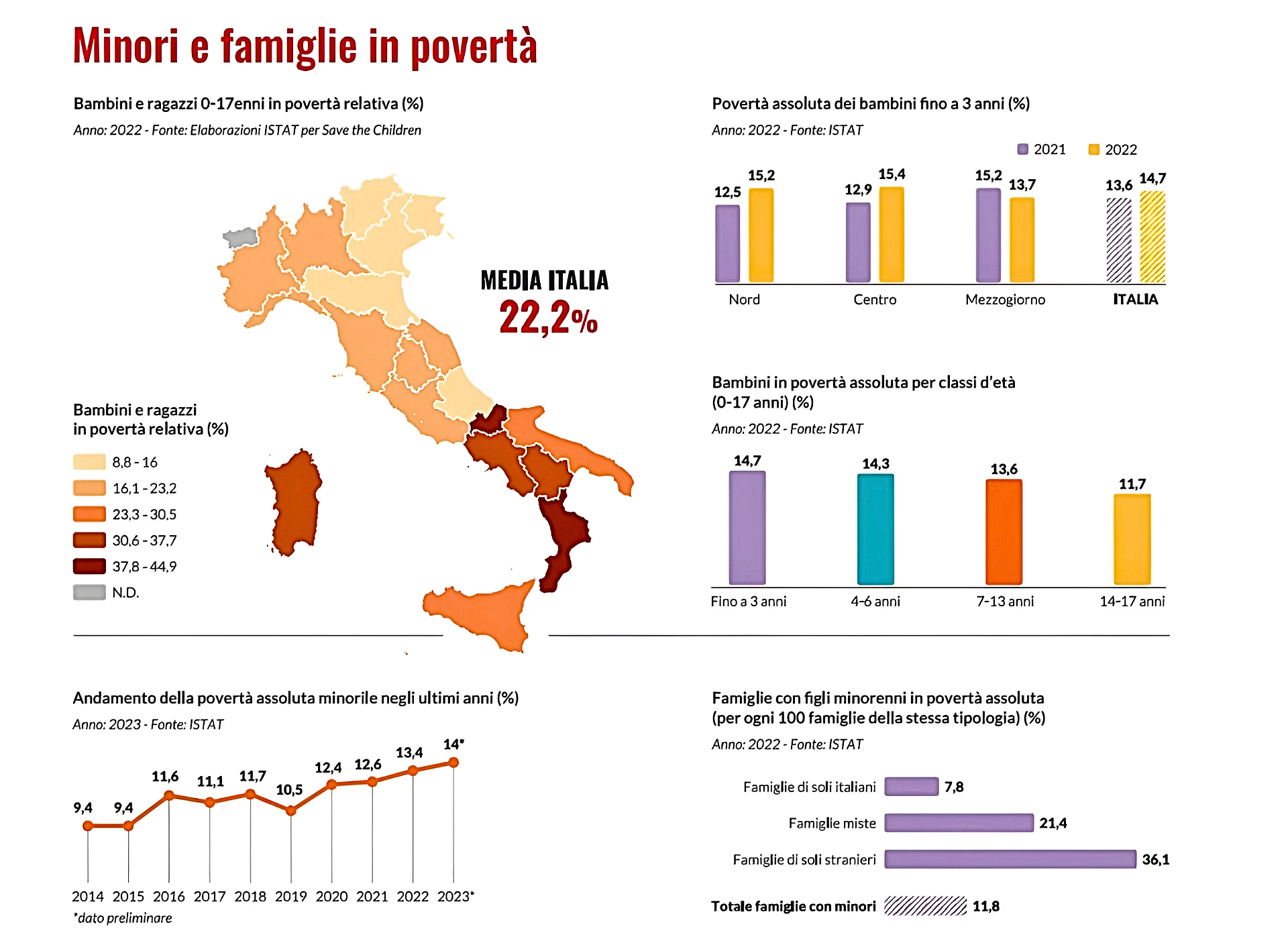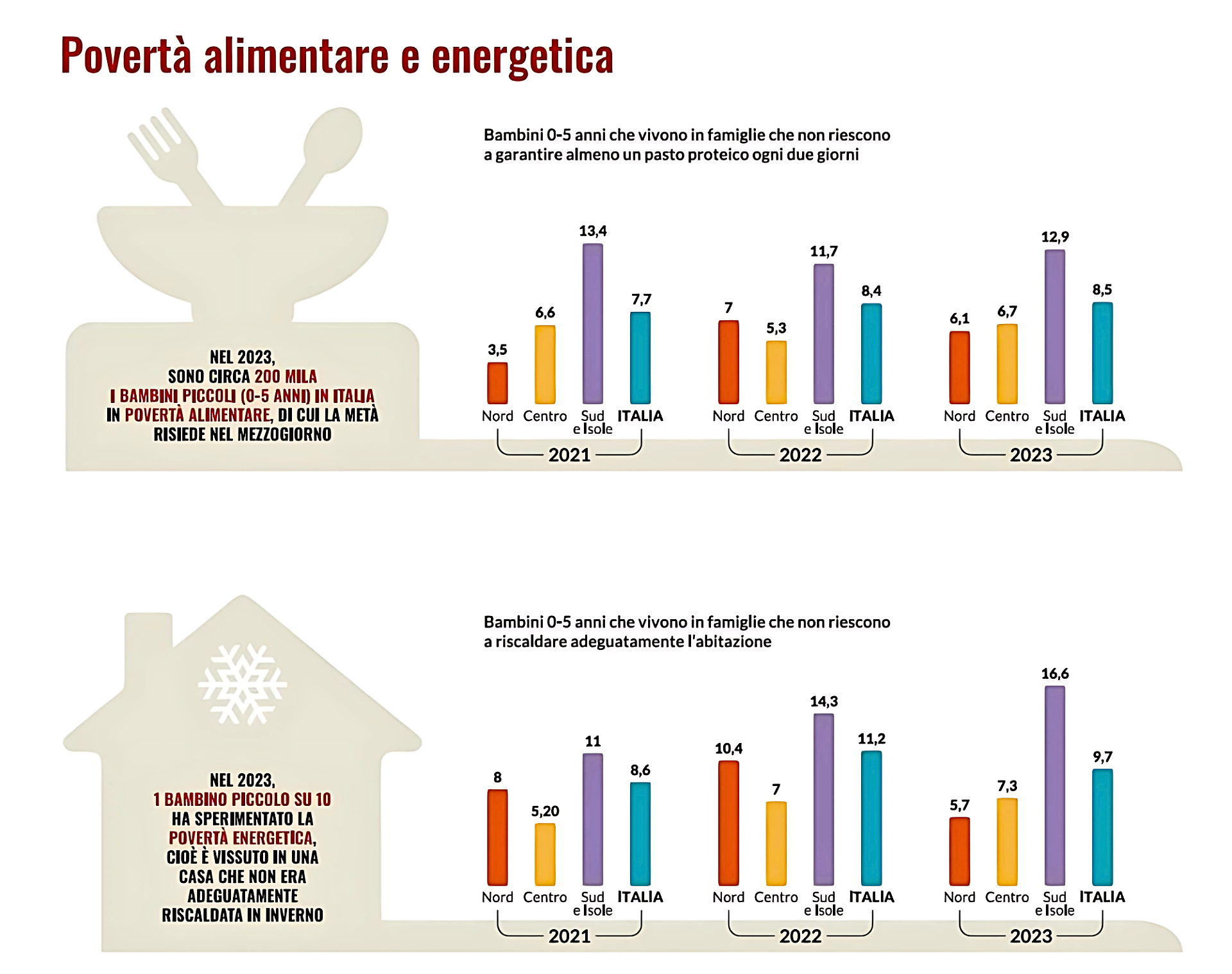 Nel suo Atlante, dedicato in particolare ai primi anni di vita, l’organizzazione « sottolinea la necessità di un cambiamento radicale delle politiche pubbliche per sanare le troppe disuguaglianze» analizzando fattori come povertà, aiuti pubblici, condizioni di vita, servizi educativi. E, per fare un quadro della situazione in Italia, parte dall’analisi dalla natalità che, nel 2023, ha conosciuto un nuovo record negativo. In Italia infatti sono nati meno di 380mila bambini, 25.039 dei quali in Piemonte che detiene di gran lunga il primato per la regione con il maggior numero di Comuni in cui non vivono bambini sotto i 3 anni di età (34 sui 72 totali in Italia), seguita da Lombardia (10 comuni) e Abruzzo (8). L’allarme più urgente, ovviamente, è quello per le condizioni economiche: «La povertà continua a colpire i minori, i più piccoli in particolare: il 13,4% delle bambine e dei bambini tra 0 e 3 anni è in povertà assoluta e circa 200mila bambini di età compresa tra 0 e 5 anni (8,5% del totale) vivono in povertà alimentare, ovvero in famiglie che non riescono a garantire almeno un pasto proteico ogni due giorni». Un dato, quest’ultimo, che al nord in appena due anni è passato dal 3,5% al 6,1%. «Quasi un bambino su dieci (9,7%) della stessa fascia d’età ha sperimentato la povertà energetica, cioè ha vissuto in una casa che non era adeguatamente riscaldata in inverno».