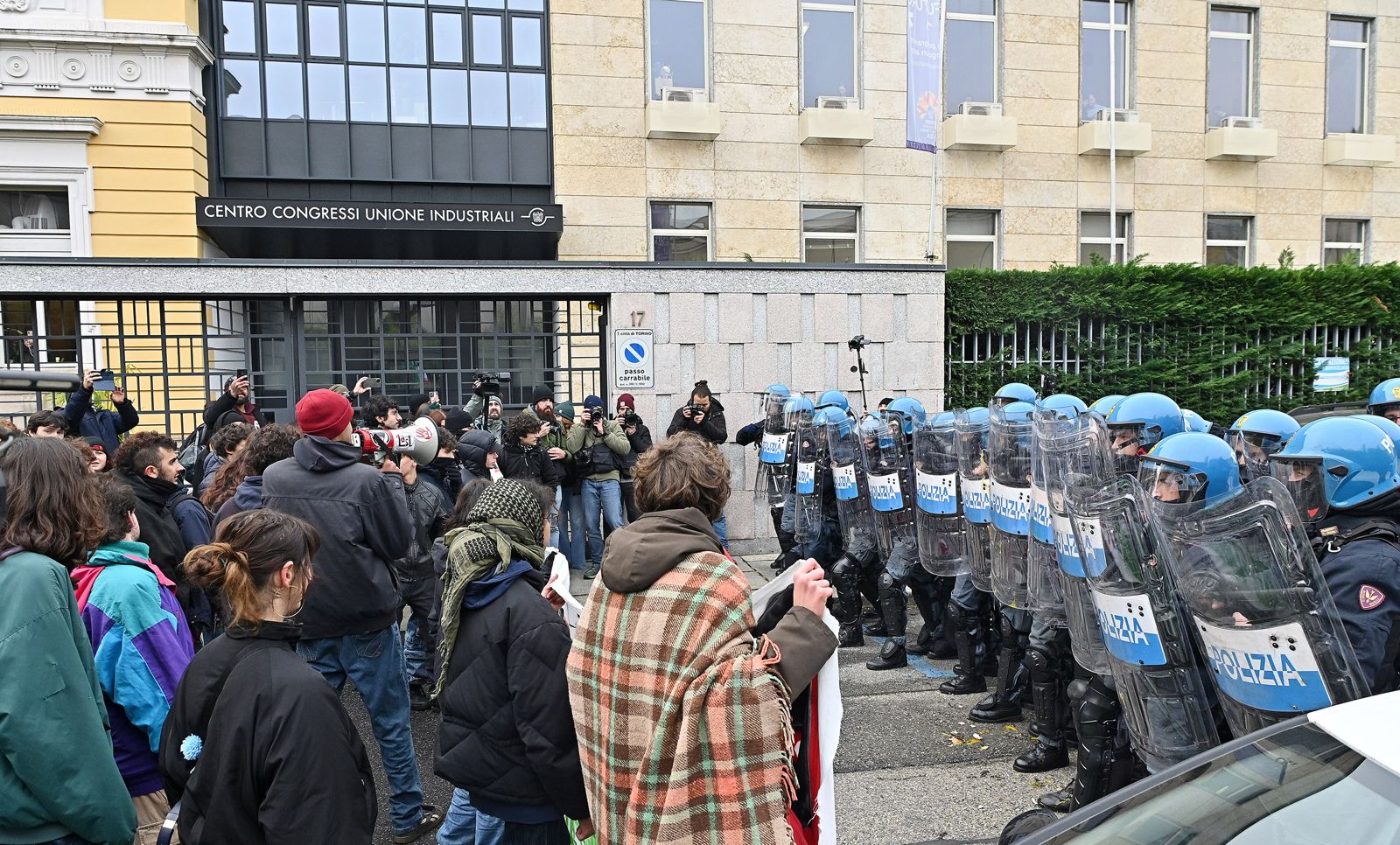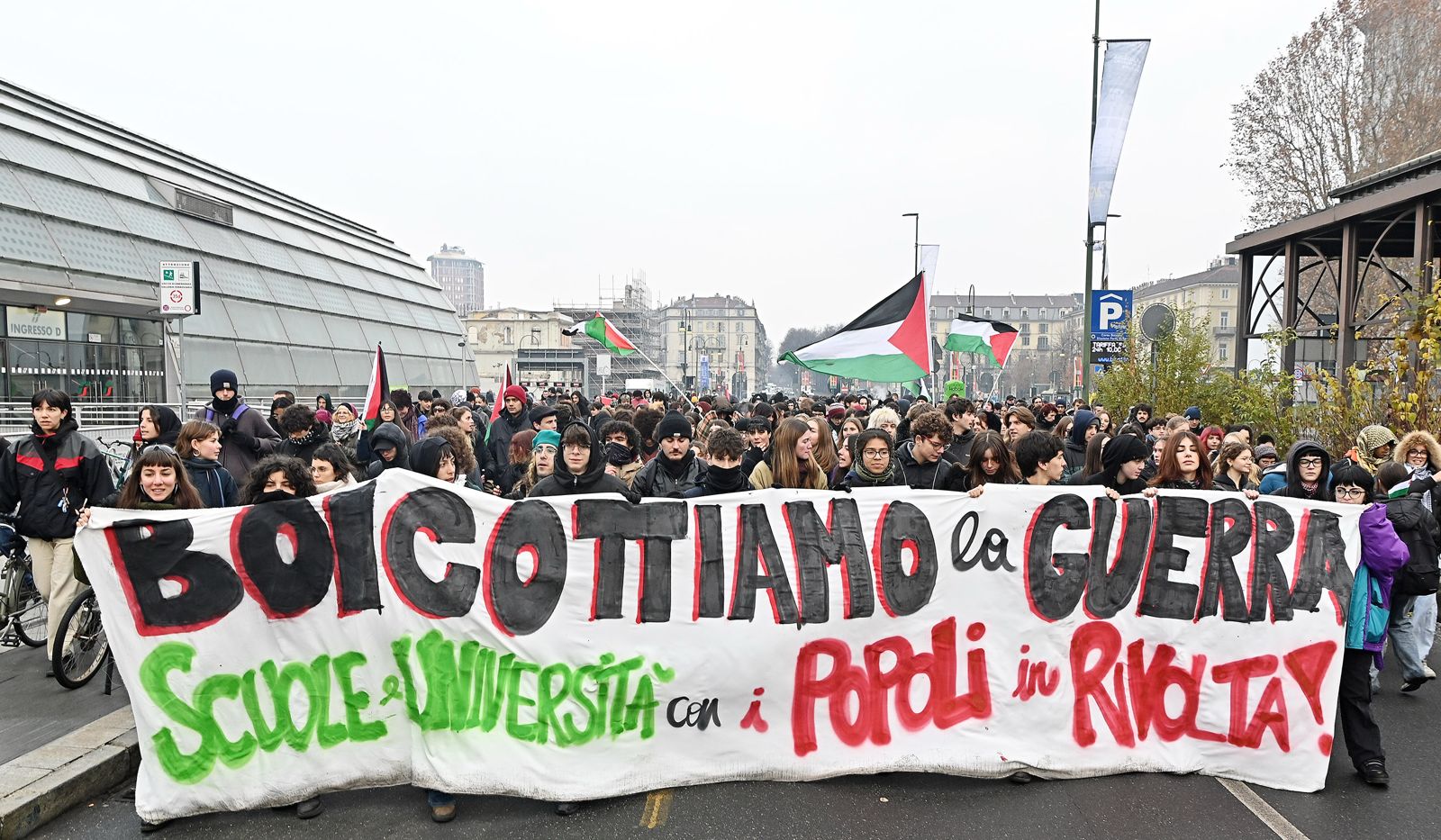 Poco prima il corteo ha fatto “tappa” sotto la sede dell’Ufficio scolastico regionale, dove i manifestanti hanno lanciato uova all’indirizzo dei mezzi del Reparto mobile della polizia. Intanto sono partiti cori e insulti nei confronti del ministro dell’Istruzione, Giuseppe Valditara. Uova e fumogeni contro la polizia anche davanti alle Ogr e al centro congressi dell’Unione industriali, con cori e insulti verso gli agenti, Confindustria e Leonardo.