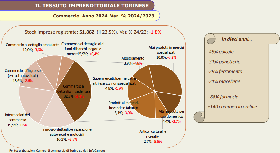 Dal 2015 quasi dimezzate le edicole (-45%), ridotte di quasi un terzo panetterie (-31%) e di un quinto le ferramenta (-29%). Esplodono invece e-commerce (+140%) e B&B (+94%). «In parte è dovuto alla scarsa attenzione della politica. Se davvero si crede che il commercio di vicinato abbia anche una funzione sociale e di sicurezza, va sostenuto attraverso un fondo. Sempre più urgente ricondurre i giganti del web a regole comuni in materia di tassazione», l’appello di Banchieri. A cui si aggiunge anche quello di Ascom Torino: «le istituzioni mettano nelle loro agende la costruzione di una politica commerciale seria», così la presidente Maria Luisa Coppa.