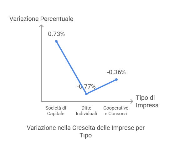 Le società di capitale, che rappresentano il 15,9% delle imprese in provincia, registrano un incremento dello 0,73%, segnando una maggiore capacità di adattamento alle sfide del mercato. Al contrario, le ditte individuali, ancora predominanti, subiscono una flessione dello 0,77%, seguite dalle cooperative e consorzi con un calo dello 0,36%.