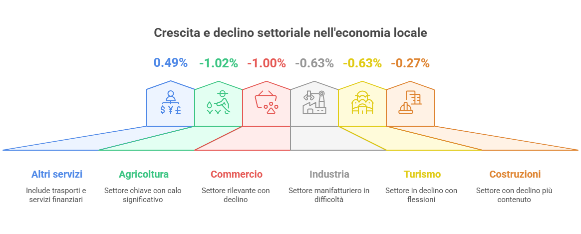 Per quanto riguarda i settori, il comparto dei "altri servizi", che include attività come trasporti, comunicazione e servizi finanziari, cresce dello 0,49%, mentre l'agricoltura e il commercio, tra i settori più rilevanti dell'economia locale, registrano cali rispettivamente del -1,02% e -1,00%. Anche l'industria e il turismo sono in difficoltà, con flessioni del -0,63%, mentre le costruzioni mostrano una flessione più contenuta, pari al -0,27%.