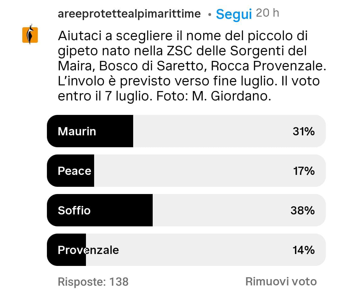 In una prima fase, il personale del Parco e i volontari coinvolti nel monitoraggio hanno proposto una lunga lista di nomi. Quattro sono arrivati in finale: Maurin, Peace, Soffio e Provenzale. Il sondaggio è aperto fino al 9 luglio, e si può partecipare attraverso il profilo Instagram delle Aree Protette Alpi Marittime o inviando una mail.