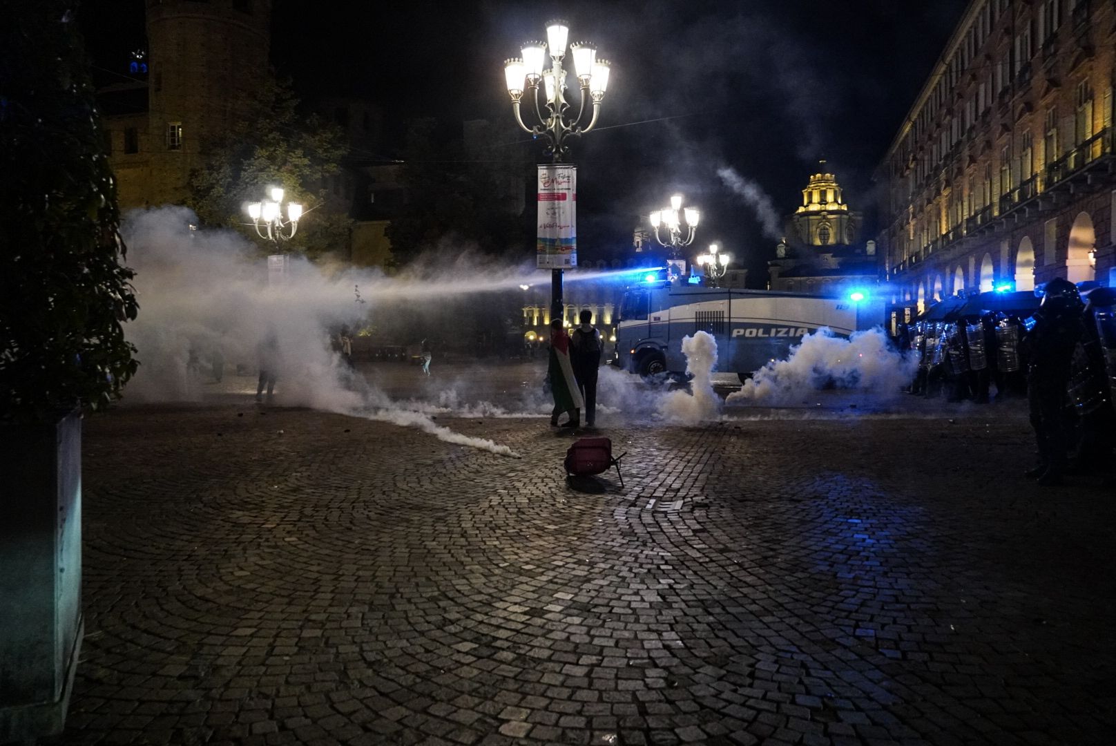 ORE 23.30: piazza Castello si è trasformata in un teatro di scontri. A Torino, la protesta pro Palestina esplode in violenza davanti alla Prefettura, dove continuano i lanci di bottiglie, sedie e altri oggetti contro le forze dell’ordine. La risposta arriva immediata: lacrimogeni fitti in direzione via Po e verso l’ingresso del Palazzo Reale, dove la folla fugge in disordine. Nel cuore della serata, in piazza è arrivato anche l’idrante della polizia, pronto a entrare in funzione nel caso i manifestanti si avvicinassero alla Prefettura. Intanto, sotto i portici di via Po, un altro fronte: un gruppo — probabilmente lo stesso autore del lancio di bottiglie — ha preso di mira l’allestimento di “Portici di Carta”, la manifestazione culturale prevista da domani. Tavoli, sedie e strutture sono stati devastati e gettati in strada. In uno dei pochi momenti di tregua, alcuni manifestanti hanno cercato di rimettere in ordine ciò che era stato rovesciato, nel tentativo di distinguersi da chi ha scelto lo scontro. Ma la calma è durata poco: nuovi lanci di oggetti verso gli agenti, nuove risposte con i lacrimogeni. Alcune centinaia di persone restano mobilitate in zona.
