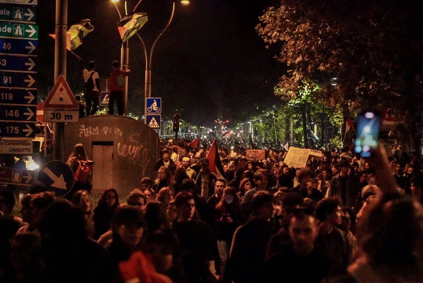 ORE 19,40: Un’onda lunga, che si allarga col passare dei minuti, tra striscioni, cori e bandiere. In serata, mentre il traffico si inceppa lungo corso Regina Margherita e i clacson rimbalzano sotto il cavalcavia di corso Principe Oddone, il corteo che era partito da piazza Castello per chiudere la giornata di sciopero generale continua a camminare. Verso Porta Palazzo, poi ancora più in là: la direzione non è chiara, ma l’intenzione sì. E si traduce in passi, slogan e blocchi stradali. Secondo le prime stime, i manifestanti sono diventati almeno diecimila. Erano cinquemila quando avevano lasciato piazza Castello, ora sono il doppio: studenti, attivisti, sindacalisti, gruppi pro-Palestina. E adesso punta verso le tangenziali. Nessun incidente, nessuna tensione. Solo la città che si ferma e osserva. Gli automobilisti inchiodano, gli autobus deviano, qualcuno applaude, altri si spazientiscono.