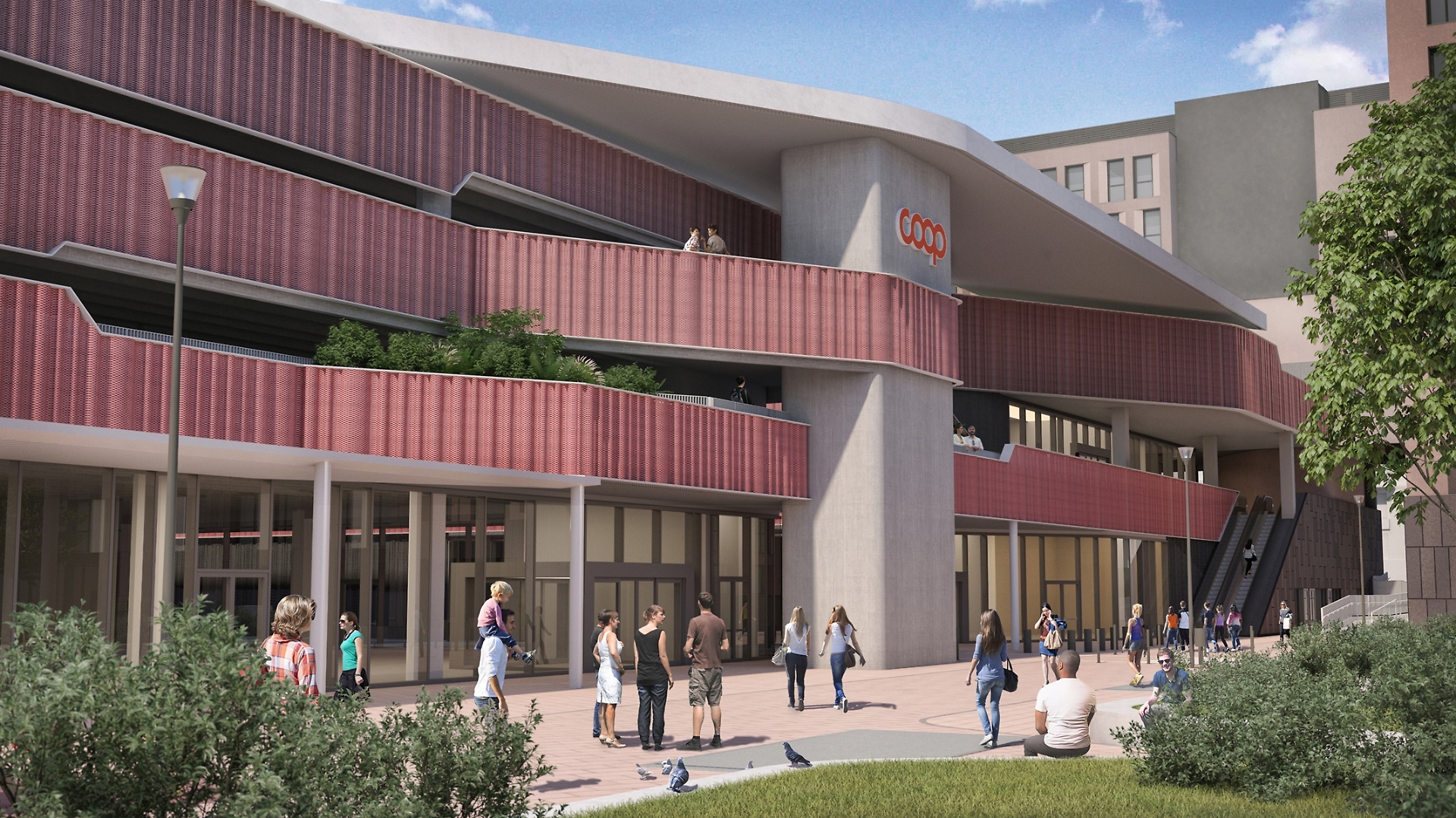 La componente commerciale, progettata e sviluppata da Nova Coop, occuperà 10 mila metri quadrati e ospiterà un mix di servizi di prossimità, ristorazione e medie superfici. Il cuore dell’offerta sarà il nuovo Superstore Coop da 2.499 metri quadrati di vendita, affiancato da spazi accessori e realizzato secondo il format “presto e bene”. Il secondo edificio accoglierà ristorazione e attività di vicinato al piano terra, mentre i due livelli superiori ospiteranno parcheggi coperti: insieme al piano interrato garantiranno 16.500 metri quadrati destinati alla sosta.