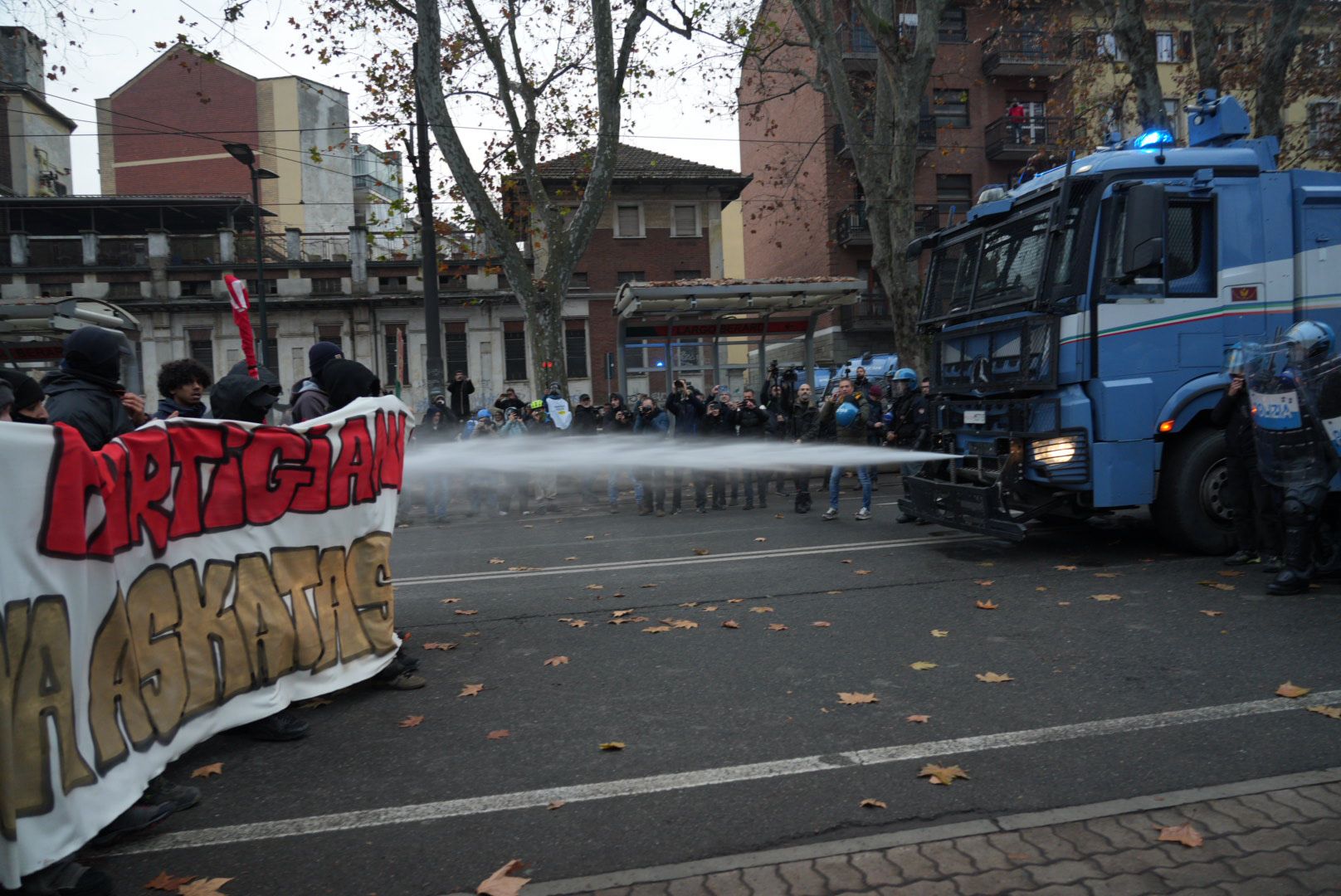 La guerriglia che trasforma corso Regina Margherita in un teatro di conflitto dura mezz’ora: gli antagonisti cercano di riprendersi “l’Aska” riparandosi dietro allo striscione che recita “Torino partigiana, que viva Askatasuna”. Avanzano in gruppo ma vengono respinti da imponenti getti d’acqua sparati dall’idrante del Reparto mobile della polizia. Così i manifestanti (che inizialmente sono 2mila davanti alla sede delle Facoltà umanistiche e poi si ingrossano fino a superare le 5mila unità) decidono di usare i bidoni come “arieti” per avanzare verso le forze dell’ordine. Vista la mala parata, i bidoni decidono di incendiarli. Il tutto mentre oltre agli idranti vengono sparati anche i lacrimogeni e in zona Vanchiglia l’aria si fa subito irrespirabile. Servono almeno due cariche per respingere indietro gli antagonisti che vogliono riprendersi il centro sociale sgomberato giovedì mattina.