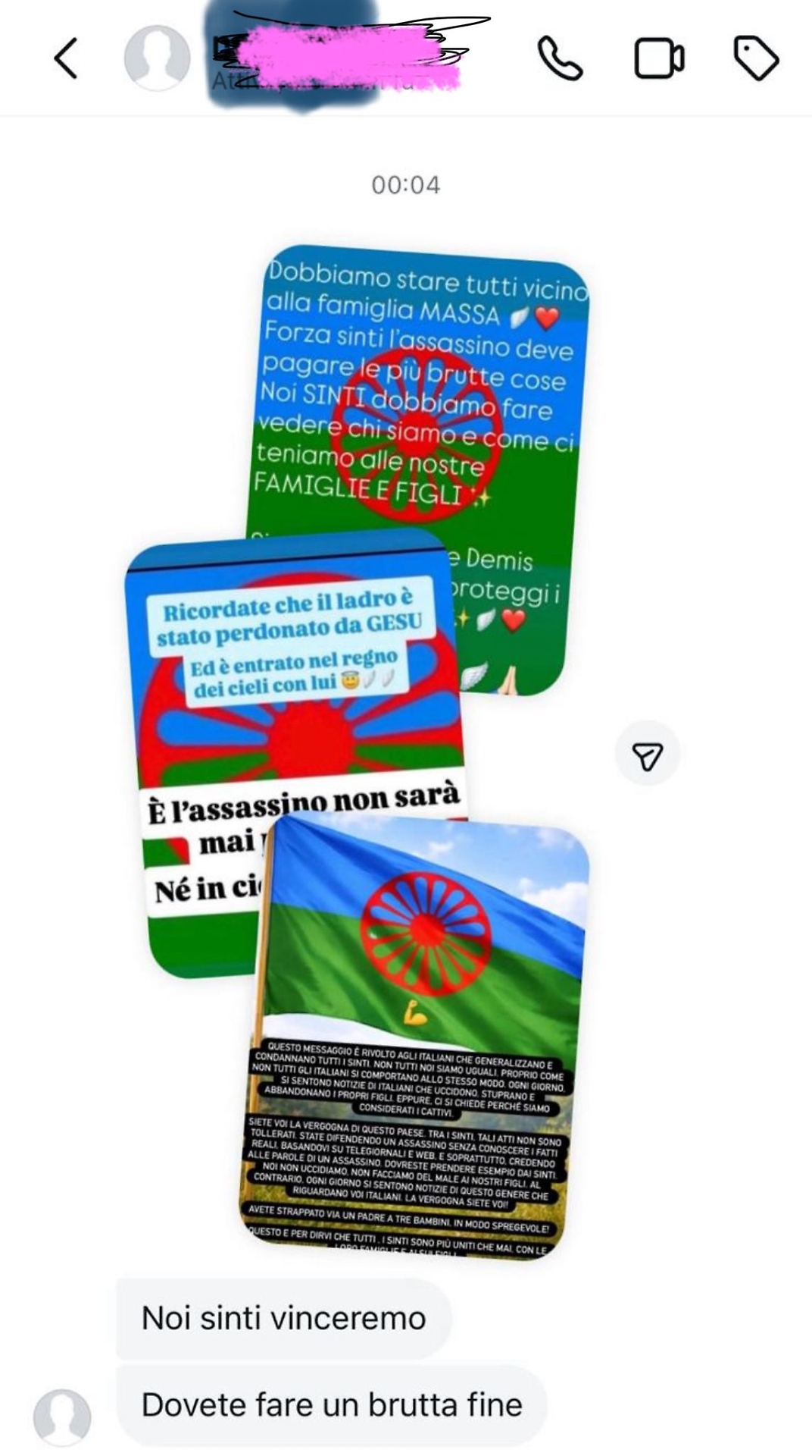 Stories su Instagram accusano “gli italiani” di generalizzare, di difendere «un assassino senza conoscere i fatti». Parole che diventano minacce quando, nell’inoltro di uno di questi messaggi alla redazione, compare una frase esplicita: «Noi sinti vinceremo, dovete fare una brutta fine».