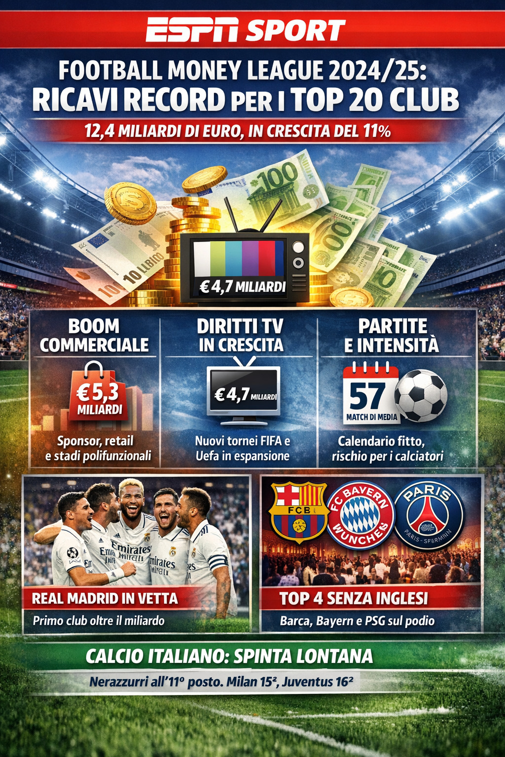 Per la prima volta in 29 anni, nessun club inglese nelle prime quattro posizioni: guidano Real Madrid, Barcellona, Bayern Monaco e Paris Saint‑Germain. Il Liverpool è quinto; il Manchester City sesto. Scivola l’Manchester United all’ottavo posto, complice il calo dei ricavi tv da 258 a 206 milioni.