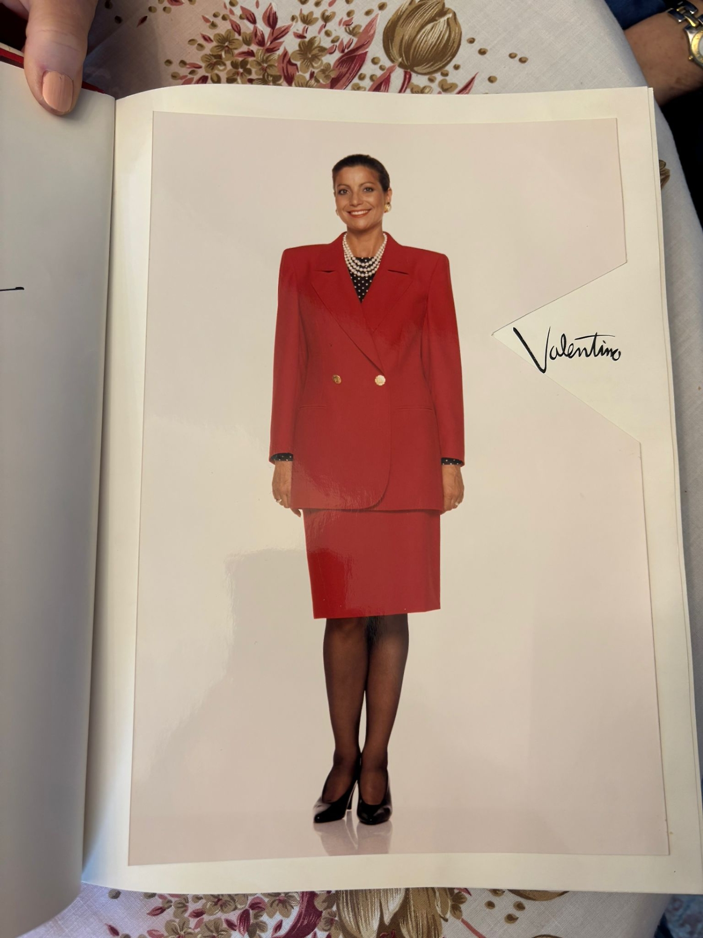 Sul tavolo c’è un grande libro di Valentino. Anna lo apre. È radiosa. In prima pagina c’è lei: tailleur rosso, il rosso Valentino, lunghezza appena sopra il ginocchio, posa semplice. Un tacco non troppo alto, calza velata scura. Più avanti, sfogliando altre pagine, una dedica: “Per Anna, con tanta simpatia e ammirazione”. Il rapporto con lo stilista era diretto, personale. «Mi diceva che davo vita ai capi. Mi chiamava la signora dai pizzi bianchi. Le prove si facevano a tu per tu. I body avevano sempre pizzi bianchi. Erano suoi». La televisione trasmette la camera ardente di Valentino. Sopra, sulla mensola, una fotografia incorniciata: una giovane Anna e un giovane Valentino. Lui le appoggia una mano sulla spalla. Lei sorride. Indossa ancora il rosso.