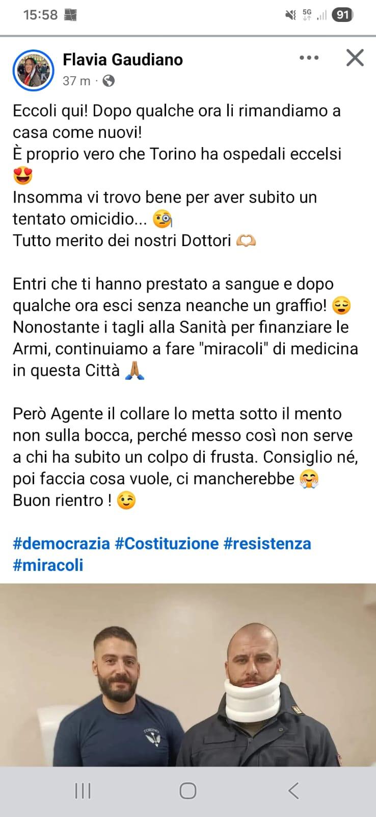 La vicenda si intreccia con un’altra polemica, legata a Rivalta: Andrea Cerutti, consigliere regionale della Lega, ha criticato la Consigliera Flavia Gaudiano, candidata a sostegno del sindaco di centrosinistra Sergio Muro, per aver ironizzato sui due agenti feriti negli scontri di Torino. «Pubblicare la foto dei servitori dello Stato ironizzando sulle dimissioni dall’ospedale non è soltanto cattivo gusto, ma un atto grave che non vorremmo mai vedere da parte di chi opera nelle istituzioni a tutti i livelli», ha detto Cerutti. Il consigliere ha chiesto alla Gaudiano di scusarsi e dimettersi, sottolineando come episodi del genere siano sintomo di una «emergenza sicurezza» percepita dai cittadini, denunciata da mesi senza ricevere risposta dalle istituzioni.