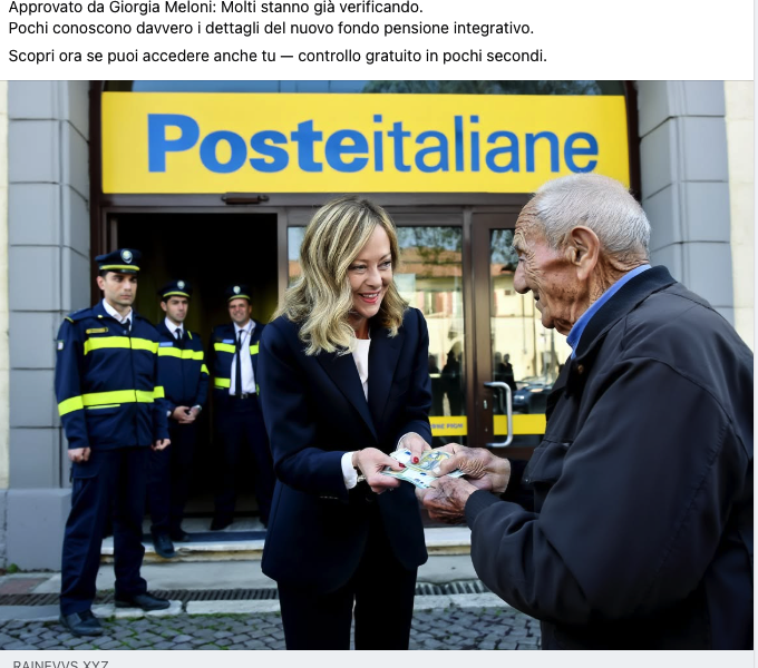 La nuova frontiera del crimine informatico corre sui social network, sfruttando l'immagine dei vertici dello Stato e le potenzialità dell'intelligenza artificiale. L'ultima truffa segnalata in queste ore punta a colpire la fascia più fragile dei navigatori, promettendo un fantomatico "Fondo Pensione Integrativo" che sarebbe stato approvato personalmente dal governo di Giorgia Meloni. Per rendere credibile il messaggio, i truffatori utilizzano una fotografia deepfake estremamente realistica, generata tramite IA, che mostra la Premier mentre porge del denaro contante a un uomo anziano proprio davanti a uno sportello di Poste Italiane.