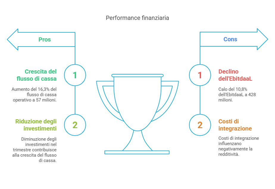 I ricavi consolidati si attestano a 1.818 milioni di euro, in calo lieve dello 0,4% rispetto ai dati pro forma (ossia come se la fusione fosse già attiva dall’inizio del 2024). Un risultato che riflette la tenuta del fatturato nonostante i cambiamenti strutturali in atto. Sul fronte della redditività, i costi legati all’integrazione pesano sull’EbitdaaL (margine operativo lordo al netto di leasing), che scende a 428 milioni, con una flessione del 10,8% su base comparabile. Tuttavia, si registra un dato positivo: l’operating free cash flow – la liquidità operativa disponibile – cresce del 16,3%, raggiungendo quota 57 milioni, grazie a una riduzione degli investimenti nel trimestre.