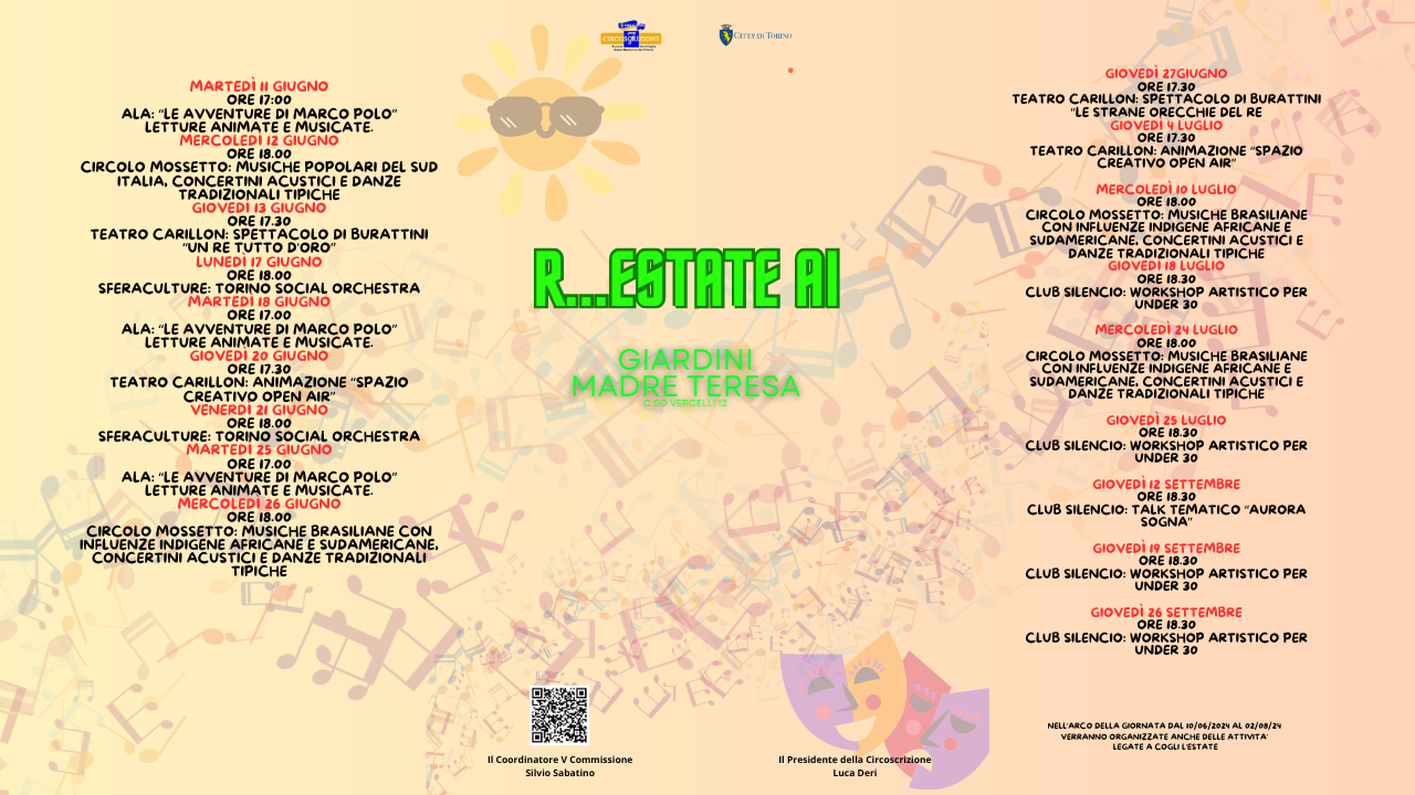 “R…Estate ai Giardini Madre Teresa” è il titolo del cartellone di appuntamenti che la Circoscrizione 7 propone fino al 26 settembre 2024 nel cuore del quartiere Aurora. La collocazione dei Giardini Madre Teresa di Calcutta, a cui si accede da corso Vercelli 12, riveste un ruolo importante nelle dinamiche di questa zona, spesso sotto i riflettori dei media per situazioni di degrado.