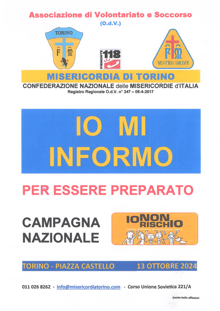 Nel contesto della campagna nazionale "Io non rischio", infatti, oltre 20 associazioni di soccorso della rete della Protezione Civile nazionale saranno presenti per dialogare con la cittadinanza, spiegare come riconoscere i rischi di grandi calamità e istruire sulle cosiddette "buone pratiche di prevenzione" fondamentali per non esporsi inutilmente ai pericoli naturali come alluvioni, frane, terremoti, incendi boschivi ed eruzioni vulcaniche. Per i cittadini torinesi, nello specifico, le associazioni coinvolte metteranno a disposizione esperti che illustreranno la frequenza e l'incidenza di tali eventi sul territorio piemontese.