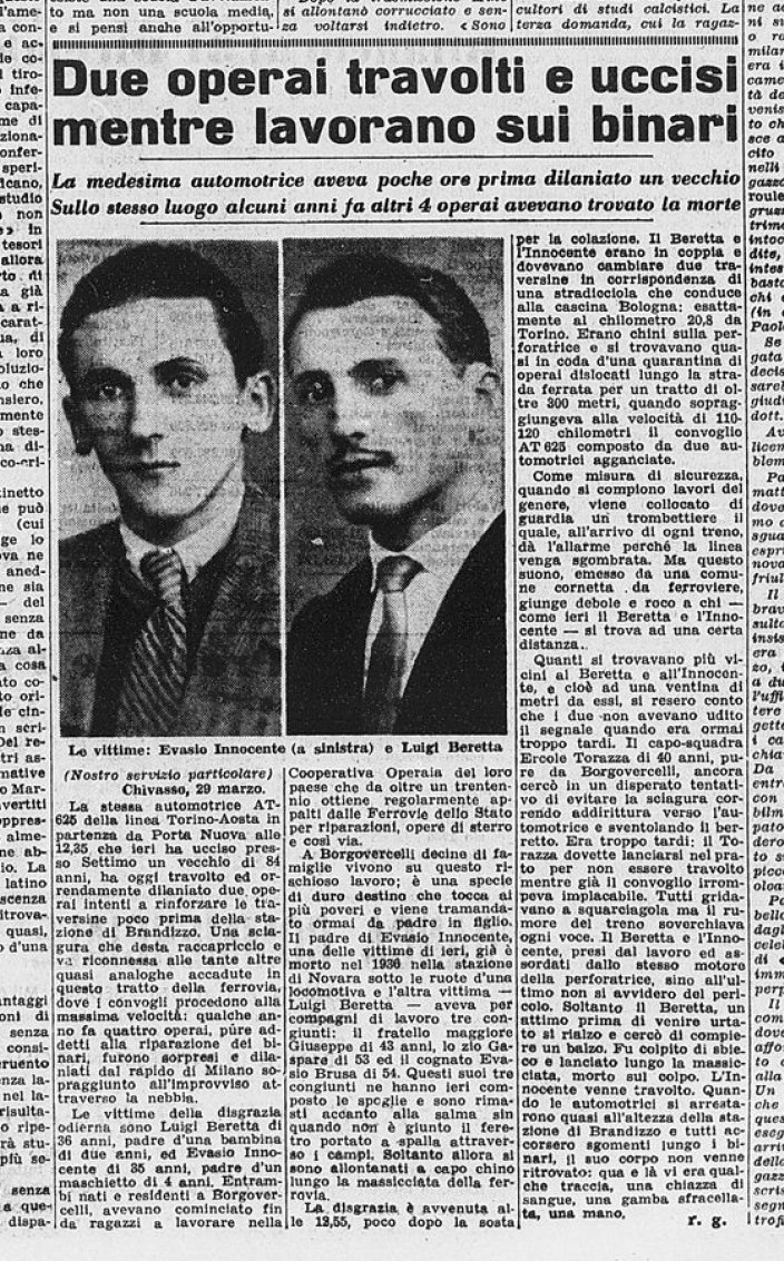 Le due vittime si chiamavano Luigi Beretta, di 36 anni, ed Evasio Innocente, 35 anni. Un'automotrice, che non aveva ricevuto il segnale di stop, era piombata all'improvviso su alcuni operai che stavano facendo dei lavori per rinforzare le traversine delle linee ferroviarie. Alcuni colleghi riuscirono a salvarsi, Luigi ed Evasio purtroppo no.