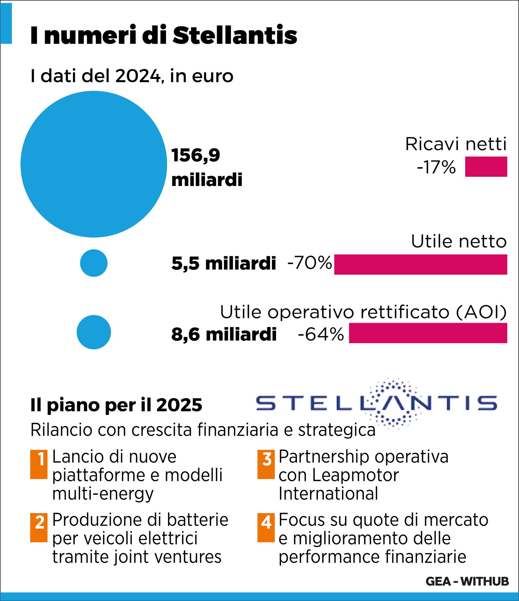 Stellantis perde il 70%, ma consegna lo stesso un dividendo positivo agli azionisti (circa 300 milioni di euro agli Elkann). E rilancia per il 2025, affidandosi anche all'intelligenza artificiale e all'innovazione. Questa la sintesi dei conti del 2024, comunicati da Amsterdam oggi, mercoledì 25 febbraio 20225. Vediamoli.