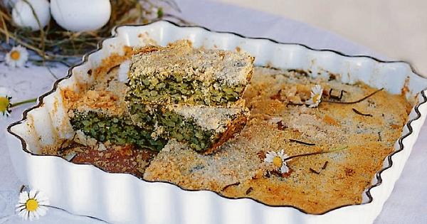 Soffriggete per qualche minuto la cipolla, all’interno di una casseruola abbastanza capiente contenente olio, burro e lardo. Aggiungete le erbette fresche tritate e salate; quando saranno quasi appassite aggiungete il riso e il brodo caldo man mano che cuoce. Portate il riso a metà cottura, sempre mescolando bene con le erbe. Il composto deve risultare molto morbido perché il riso, ultimando la cottura in forno, assorbirà tutto il liquido. Quando il composto si sarà raffreddato aggiungete le uova, il formaggio, un trito di erbe aromatiche, un pizzico di spezie a voi gradite e aggiustate di sale. Versate il tutto in un tegame da forno unto e cosparso di formaggio grattugiato. Spolverizzate ancora la superficie della torta verde con parmigiano grattugiato e un po’ di pan grattato.