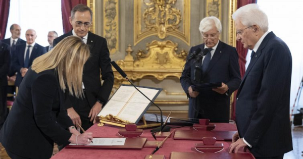 In poco più di mezzora tutti i ministri hanno firmato e il nuovo governo ha giurato nelle mani del Presidente e davanti a una copia della prima